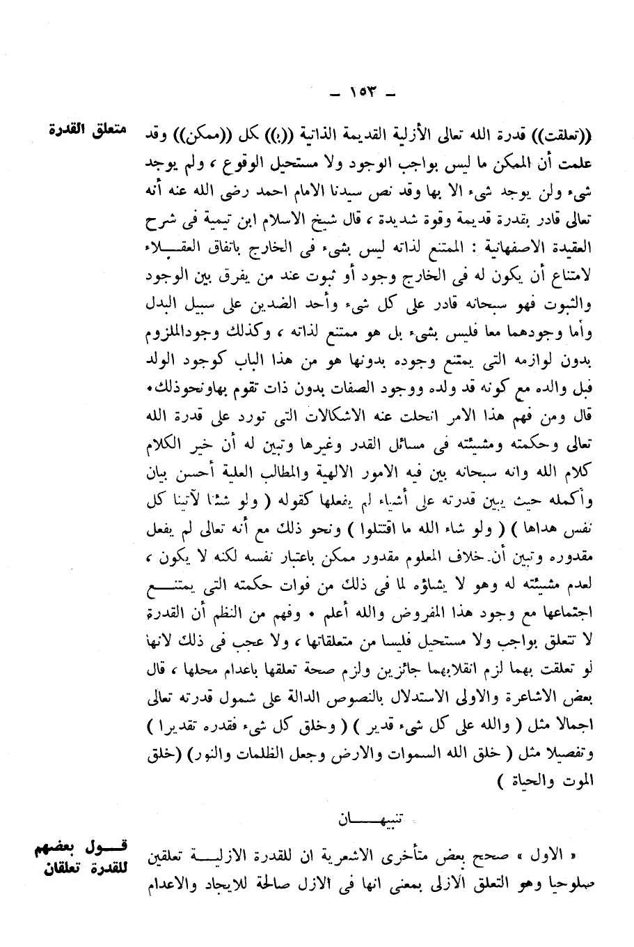 " الْأَوَّلُ " صَحَّحَ بَعْضُ مُتَأَخِّرِي الْأَشْعَرِيَّةِ أَنَّ لِلْقُدْرَةِ الْأَزَلِيَّةِ تَعَلُّقَيْنِ صُلُوحِيًّا وَهُوَ التَّعَلُّقُ الْأَزَلِيُّ بِمَعْنَى أَنَّهُ فِي الْأَزَلِ صَالِحَةٌ لِلْإِيجَادِ وَالْإِعْدَامِ