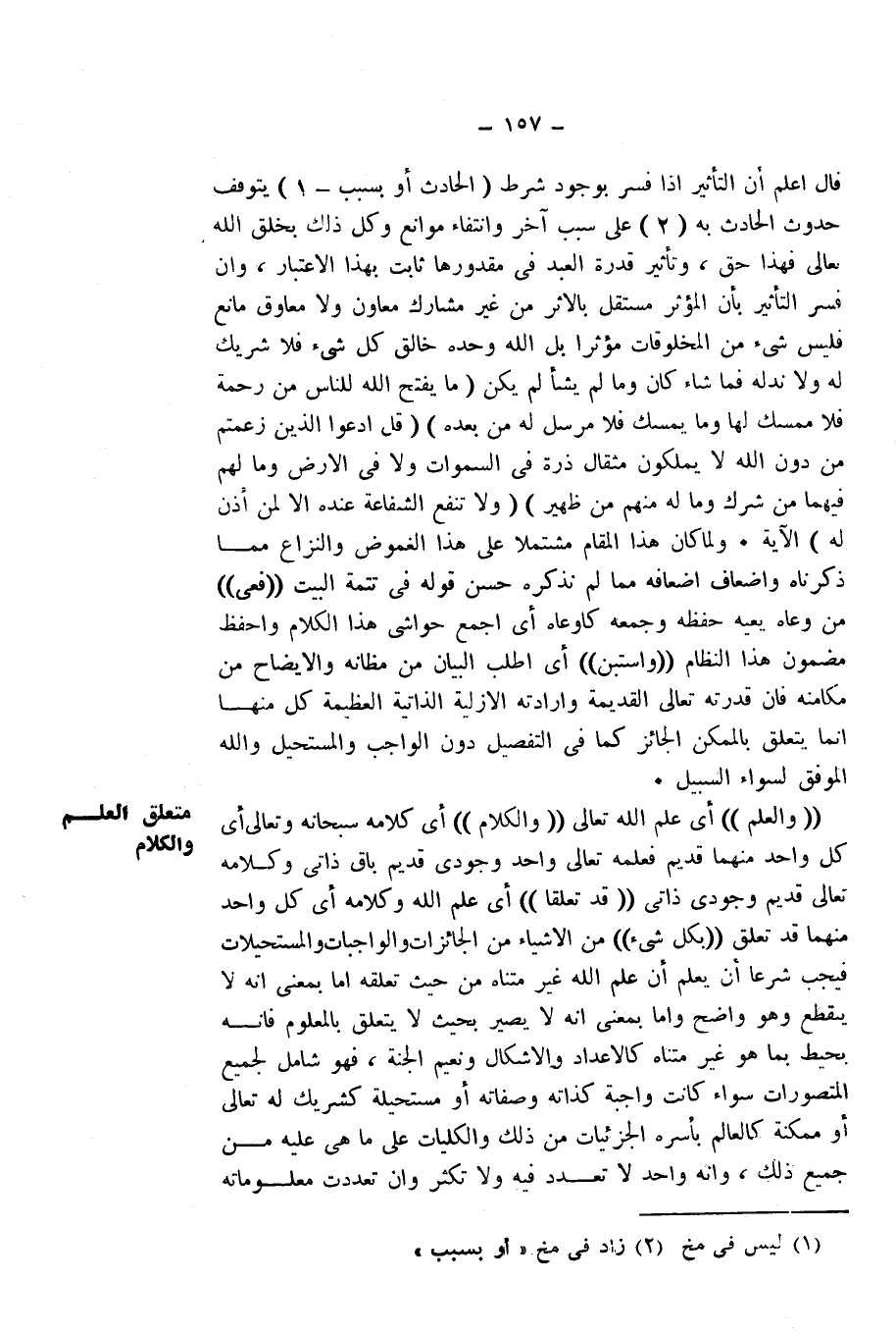 قَالَ: اعْلَمْ أَنَّ التَّأْثِيرَ إِذَا فُسِّرَ بِوُجُودِ شَرْطِ (الْحَادِثِ أَوْ بِسَبَبٍ - 1) يَتَوَقَّفُ حُدُوثُ الْحَادِثِ بِهِ (2) عَلَى سَبَبٍ آخَرَ وَانْتِفَاءِ مَوَانِعَ وَكُلُّ ذَلِكَ بِخَلْقِ اللَّهِ تَعَالَى فَهَذَا حَقٌّ، وَتَأْثِيرُ قُدْرَةِ الْعَبْدِ فِي مَقْدُورِهَا ثَابِتٌ بِهَذَا الِاعْتِبَارِ، وَإِنْ فُسِّرَ التَّأْثِيرُ بِأَنَّ الْمُؤَثِّرَ مُسْتَقِلٌّ بِالْأَثَرِ مِنْ غَيْرِ مُشَارِكٍ مُعَاوِنٍ، وَلَا مُعَاوِقٍ مَانِعٍ، فَلَيْسَ شَيْءٌ مِنَ الْمَخْلُوقَاتِ مُؤَثِّرًا، بَلِ اللَّهُ وَحْدَهُ خَالِقُ كُلِّ شَيْءٍ فَلَا شَرِيكَ لَهُ، وَلَا نِدَّ لَهُ، فَمَا شَاءَ كَانَ، وَمَا لَمْ يَشَأْ لَمْ يَكُنْ، {مَا يَفْتَحِ اللَّهُ لِلنَّاسِ مِنْ رَحْمَةٍ فَلَا مُمْسِكَ لَهَا وَمَا يُمْسِكْ فَلَا مُرْسِلَ لَهُ مِنْ بَعْدِهِ} [فاطر: 2] ، {قُلِ ادْعُوا الَّذِينَ زَعَمْتُمْ مِنْ دُونِ اللَّهِ لَا يَمْلِكُونَ مِثْقَالَ ذَرَّةٍ فِي السَّمَاوَاتِ وَلَا فِي الْأَرْضِ وَمَا لَهُمْ فِيهِمَا مِنْ شِرْكٍ وَمَا لَهُ مِنْهُمْ مِنْ ظَهِيرٍ} [سبأ: 22] {وَلَا تَنْفَعُ الشَّفَاعَةُ عِنْدَهُ إِلَّا لِمَنْ أَذِنَ لَهُ} [سبأ: 23] الْآيَةَ.