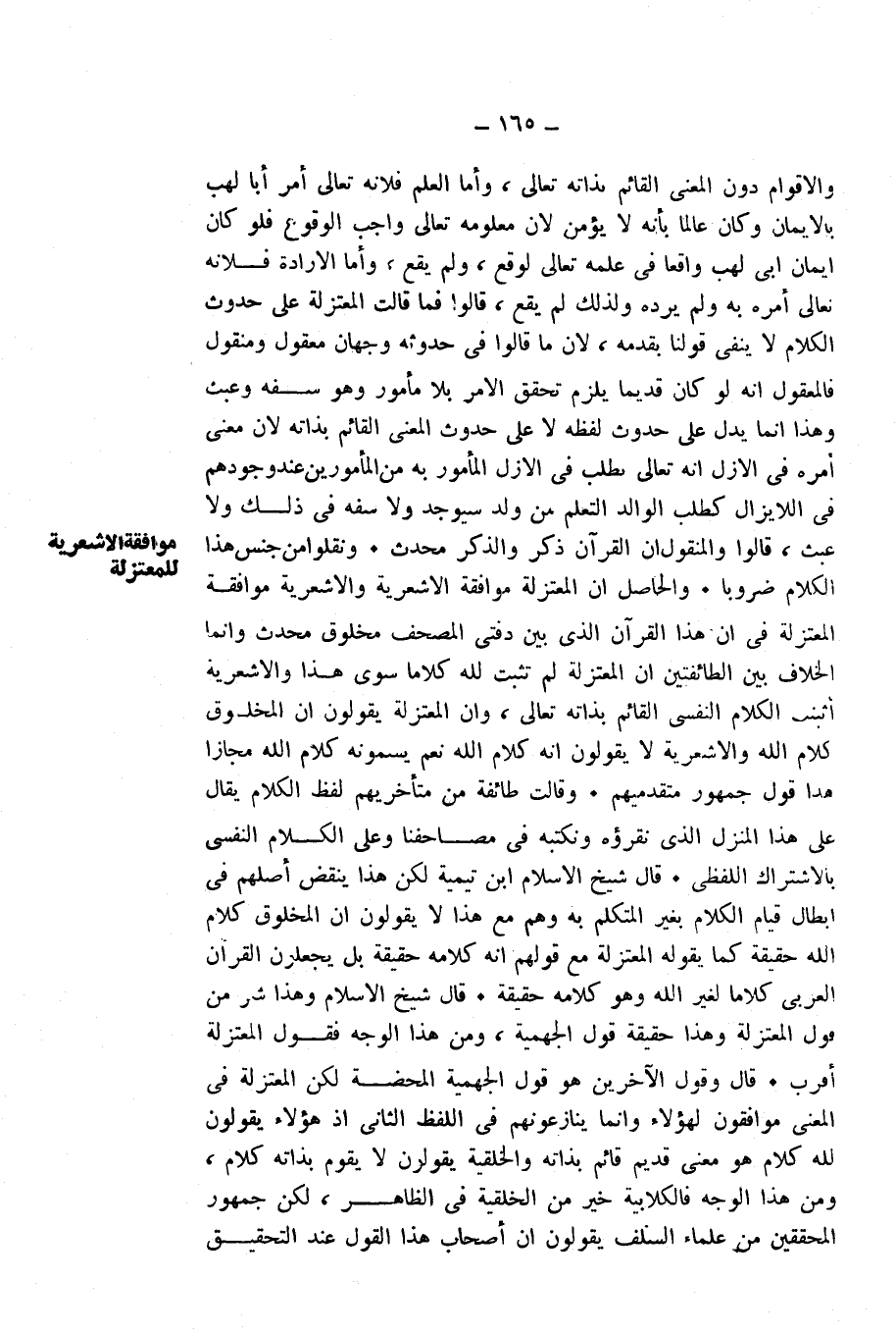 وَالْحَاصِلُ أَنَّ الْمُعْتَزِلَةَ مُوَافِقَةٌ الْأَشْعَرِيَّةَ، وَالْأَشْعَرِيَّةَ مُوَافِقَةٌ الْمُعْتَزِلَةَ فِي أَنَّ هَذَا الْقُرْآنَ الَّذِي بَيْنَ دَفَّتَيِ الْمُصْحَفِ مَخْلُوقٌ مُحْدَثٌ وَإِنَّمَا الْخِلَافُ بَيْنَ الطَّائِفَتَيْنِ أَنَّ الْمُعْتَزِلَةَ لَمْ تُثْبِتْ لِلَّهِ كَلَامًا سِوَى هَذَا، وَالْأَشْعَرِيَّةَ أَثْبَتَتِ الْكَلَامَ النَّفْسِيَّ الْقَائِمَ بِذَاتِهِ تَعَالَى، وَأَنَّ الْمُعْتَزِلَةَ يَقُولُونَ: إِنَّ الْمَخْلُوقَ كَلَامُ اللَّهِ، وَالْأَشْعَرِيَّةَ لَا يَقُولُونَ أَنَّهُ كَلَامُ اللَّهِ، نَعَمْ يُسَمُّونَهُ كَلَامَ اللَّهِ مَجَازًا هَذَا قَوْلُ جُمْهُورِ مُتَقَدِّمِيهِمْ، وَقَالَتْ طَائِفَةٌ مِنْ مُتَأَخَّرِيهِمْ: لَفْظُ كَلَامٍ يُقَالُ عَلَى هَذَا الْمَنْزِلِ الَّذِي نَقْرَؤُهُ وَنَكْتُبُهُ فِي مَصَاحِفِنَا، وَعَلَى الْكَلَامِ النَّفْسِيِّ بِالِاشْتِرَاكِ اللَّفْظِيِّ.