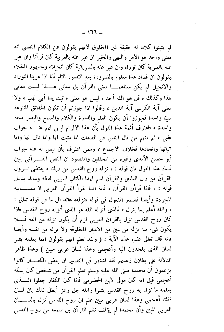 وَالْمَقْصُودُ أَنَّ النَّصَّ الْقُرْآنِيَّ يُبَيِّنُ فَسَادَ هَذَا الْقَوْلِ، فَإِنَّ قَوْلَهُ: {نَزَّلَهُ رُوحُ الْقُدُسِ مِنْ رَبِّكَ} [النحل: 102] يَقْتَضِي نُزُولَ الْقُرْآنِ مِنْ رَبِّ الْعَالَمِينَ، وَالْقُرْآنُ اسْمٌ لِهَذَا الْكِتَابِ الْعَرَبِيِّ لَفْظُهُ وَمَعْنَاهُ بِدَلِيلِ قَوْلِهِ: {فَإِذَا قَرَأْتَ الْقُرْآنَ} [النحل: 98] فَإِنَّهُ مَنْ يَقْرَأُ الْقُرْآنَ الْعَرَبِيَّ لَا مَعَانِيَهُ الْمُجَرَّدَةَ.