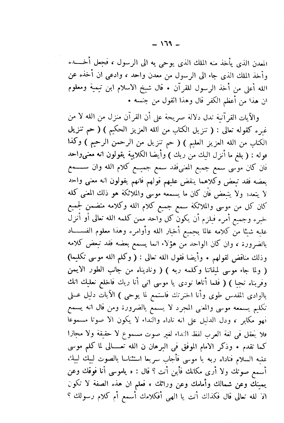 وَأَيْضًا الْكُلَّابِيَّةُ يَقُولُونَ: أَنَّهُ مَعْنًى وَاحِدٌ فَإِنْ كَانَ مُوسَى سَمِعَ جَمِيعَ الْمَعْنَى، فَقَدْ سَمِعَ جَمِيعَ كَلَامِ اللَّهِ، وَإِنْ سَمِعَ بَعْضَهُ فَقَدْ تَبَعَّضَ، وَكِلَاهُمَا يُنْقَضُ عَلَيْهِمْ وَقَوْلُهُمْ فَإِنَّهُمْ يَقُولُونَ أَنَّهُ مَعْنًى وَاحِدٌ لَا يَتَعَدَّدُ وَلَا يَتَبَعَّضُ فَإِنْ كَانَ مَا يَسْمَعُهُ مُوسَى وَالْمَلَائِكَةُ هُوَ ذَلِكَ الْمَعْنَى كُلُّهُ، كَانَ كُلٌّ مِنْ مُوسَى وَالْمَلَائِكَةِ سَمِعَ جَمِيعَ كَلَامِ اللَّهِ وَكَلَامُهُ مُتَضَمِّنٌ لِجَمِيعِ خَبَرِهِ وَجَمِيعِ أَمْرِهِ، فَيَلْزَمُ أَنْ يَكُونَ كُلُّ وَاحِدٍ مِمَّنْ كَلَّمَهُ اللَّهُ تَعَالَى أَوْ أَنْزَلَ عَلَيْهِ شَيْئًا مِنْ كَلَامِهِ عَالِمًا بِجَمِيعِ أَخْبَارِ اللَّهِ وَأَوَامِرِهِ، وَهَذَا مَعْلُومُ الْفَسَادِ بِالضَّرُورَةِ، إِنْ كَانَ الْوَاحِدُ مِنْ هَؤُلَاءِ إِنَّمَا يَسْمَعُ بَعْضَهُ فَقَدْ تَبَعَّضَ كَلَامُهُ، وَذَلِكَ مُنَاقِضٌ لِقَوْلِهِمْ.