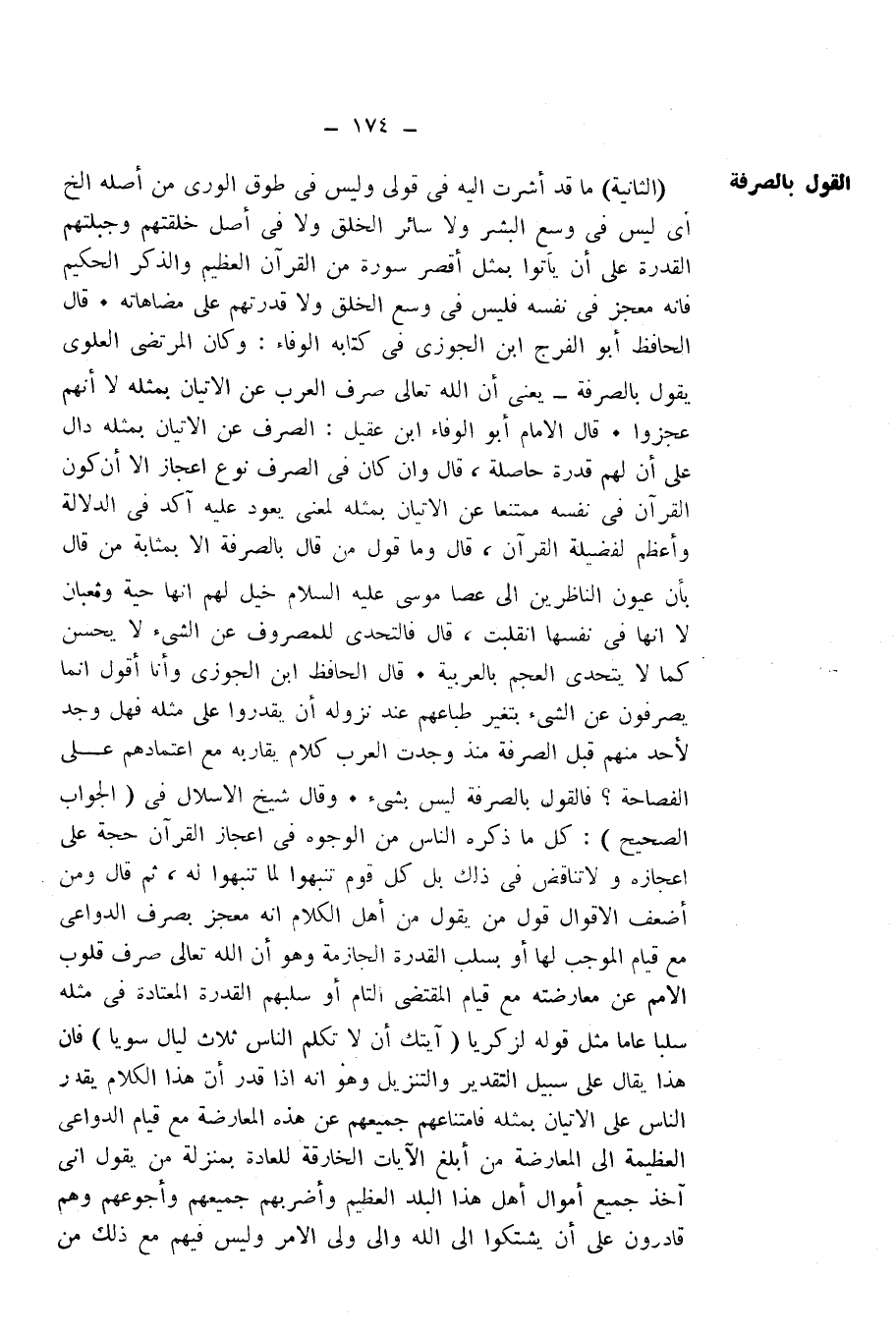 وَقَالَ الْحَافِظُ أَبُو الْفَرَجِ بْنُ الْجَوْزِيِّ فِي كِتَابِهِ الْوَفَاءِ: وَكَانَ الْمُرْتَضَى الْعَلَوِيُّ يَقُولُ بِالصَّرْفَةِ - يَعْنِي أَنَّ اللَّهَ تَعَالَى صَرَفَ الْعَرَبَ عَلَى الْإِتْيَانِ بِمِثْلِهِ لَا أَنَّهُمْ عَجَزُوا.