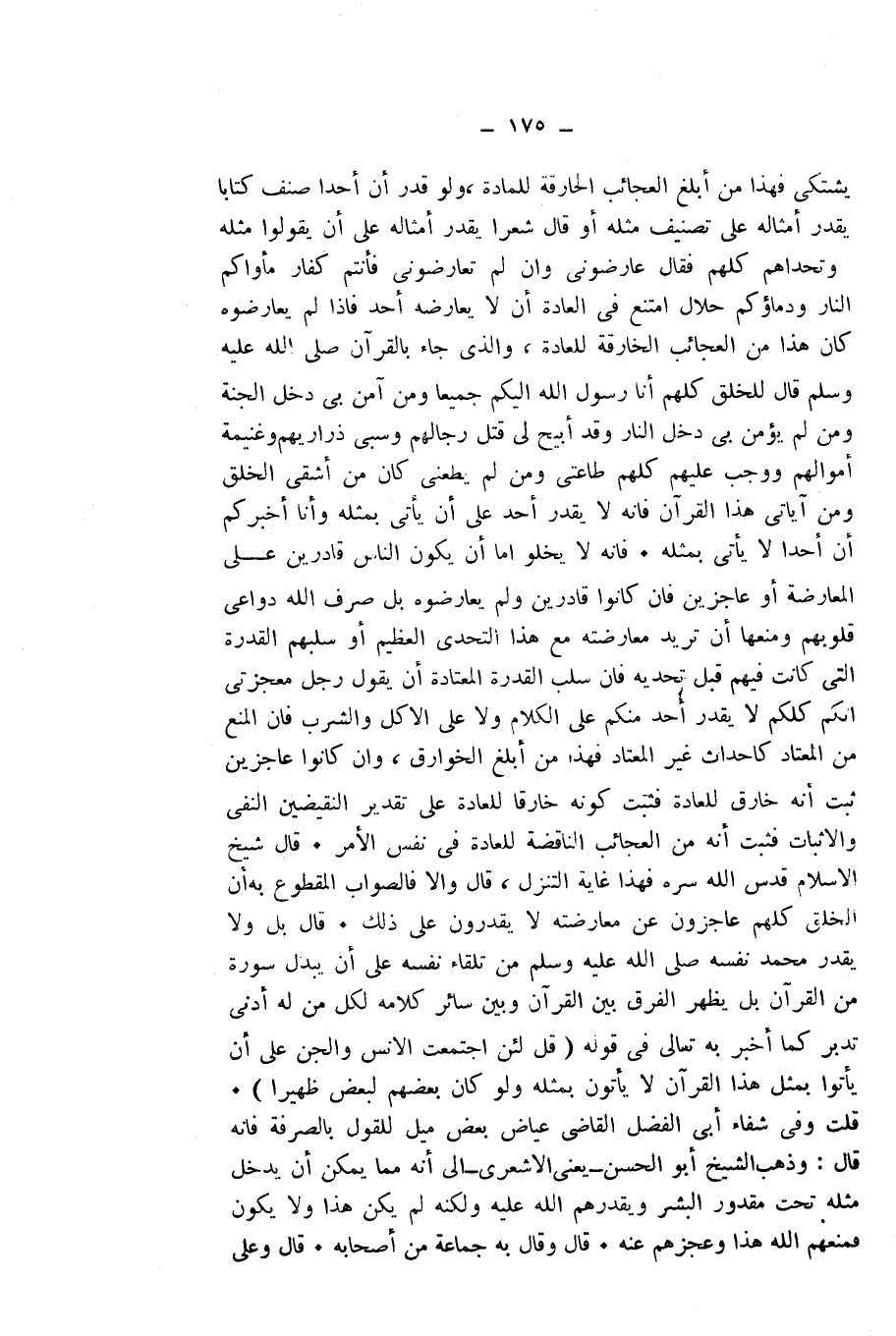 قُلْتُ: وَفِي شِفَاءِ أَبِي الْفَضْلِ الْقَاضِي عِيَاضٍ بَعْضُ مَيْلٍ لِلْقَوْلِ بِالصَّرْفَةِ؛ فَإِنَّهُ قَالَ: وَذَهَبَ الشَّيْخُ أَبُو الْحَسَنِ - يَعْنِي الْأَشْعَرِيَّ - إِلَى أَنَّهُ مِمَّا يُمْكِنُ أَنْ يَدْخُلَ مِثْلُهُ تَحْتَ مَقْدُورِ الْبَشَرِ وَيُقَدِّرُهُمُ اللَّهُ عَلَيْهِ، وَلَكِنَّهُ لَمْ يَكُنْ هَذَا، وَلَا يَكُونُ فَمَنَعَهُمُ اللَّهُ هَذَا، وَعَجَّزَهُمْ عَنْهُ. قَالَ: وَقَالَ بِهِ جَمَاعَةٌ مِنْ أَصْحَابِهِ.
