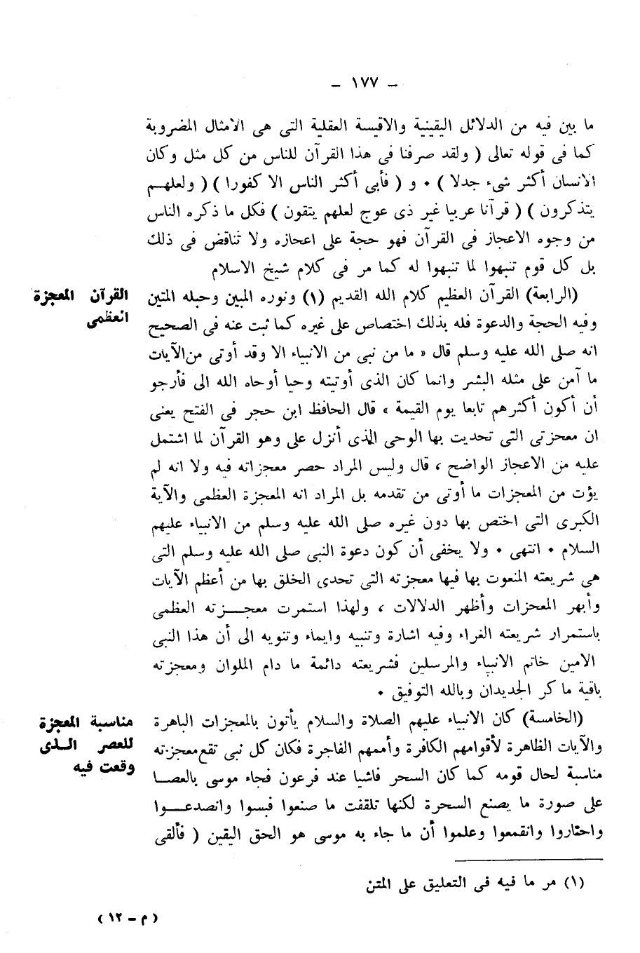 مَا بُيِّنَ فِيهِ مِنَ الدَّلَائِلِ الْيَقِينِيَّةِ وَالْأَقْيِسَةِ الْعَقْلِيَّةِ الَّتِي هِيَ الْأَمْثَالُ الْمَضْرُوبَةُ كَمَا فِي قَوْلِهِ تَعَالَى {وَلَقَدْ صَرَّفْنَا فِي هَذَا الْقُرْآنِ لِلنَّاسِ مِنْ كُلِّ مَثَلٍ وَكَانَ الْإِنْسَانُ أَكْثَرَ شَيْءٍ جَدَلًا} [الكهف: 54] . وَفِي {فَأَبَى أَكْثَرُ النَّاسِ إِلَّا كُفُورًا} [الإسراء: 89] ، وَ {لَعَلَّهُمْ يَتَذَكَّرُونَ} [البقرة: 221] ، {قُرْآنًا عَرَبِيًّا غَيْرَ ذِي عِوَجٍ لَعَلَّهُمْ يَتَّقُونَ} [الزمر: 28] فَكُلُّ مَا ذَكَرَهُ النَّاسُ مِنْ وُجُوهِ الْإِعْجَازِ فِي الْقُرْآنِ فَهُوَ حُجَّةٌ عَلَى إِعْجَازِهِ، وَلَا تَنَاقُضَ فِي ذَلِكَ بَلْ كُلُّ قَوْمٍ تَنَبَّهُوا لِمَا تَنَبَّهُوا لَهُ كَمَا فِي كَلَامِ شَيْخِ الْإِسْلَامِ.