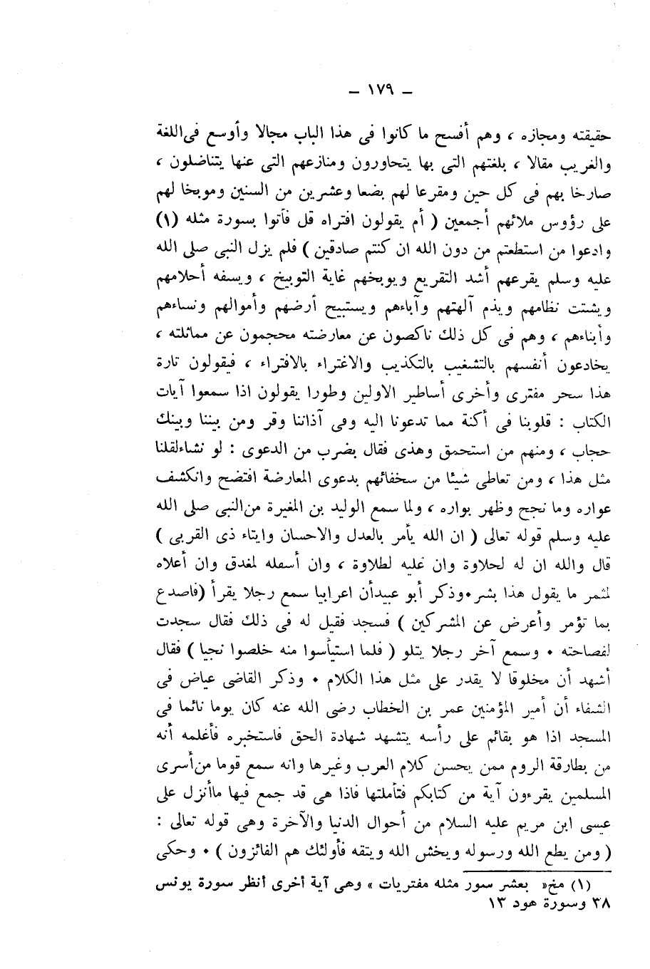 حَقِيقَتُهُ وَمَجَازُهُ، وَهُمْ أَفْسَحُ مَا كَانُوا فِي هَذَا الْبَابِ مَجَالًا، وَأَوْسَعُ فِي اللُّغَةِ وَالْغَرِيبِ مَقَالًا، وَبِلُغَتِهِمُ الَّتِي بِهَا يَتَحَاوَرُونَ وَمَنَازِعِهِمِ الَّتِي عَنْهَا يَتَنَاضَلُونَ، صَارِخًا بِهِمْ فِي كُلِّ حِينٍ، وَمُقَرِّعًا لَهُمْ بَعْضًا وَعِشْرِينَ مِنَ السِّنِينَ، وَمُوَبِّخًا لَهُمْ عَلَى رُؤُوسِ مَلَئِهِمْ أَجْمَعِينَ {أَمْ يَقُولُونَ افْتَرَاهُ قُلْ فَأْتُوا بِسُورَةٍ مِثْلِهِ وَادْعُوا مَنِ اسْتَطَعْتُمْ مِنْ دُونِ اللَّهِ إِنْ كُنْتُمْ صَادِقِينَ} [يونس: 38] .