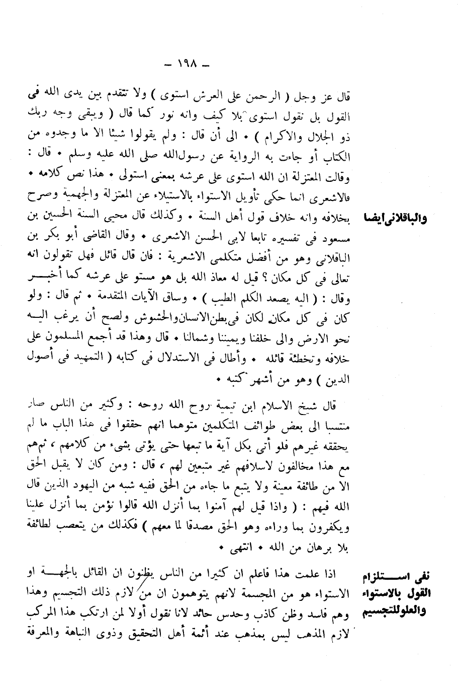 وَقَالَ الْقَاضِي أَبُو بَكْرِ بْنُ الْبَاقِلَّانِيِّ وَهُوَ مِنْ أَفْضَلِ مُتَكَلِّمِي الْأَشْعَرِيَّةِ: فَإِنْ قَالَ قَائِلٌ فَهَلْ تَقُولُونَ إِنَّهُ تَعَالَى فِي كُلِّ مَكَانٍ؟ قِيلَ لَهُ مَعَاذَ اللَّهِ، بَلْ هُوَ مُسْتَوٍ عَلَى عَرْشِهِ كَمَا أَخْبَرَ، وَقَالَ: {إِلَيْهِ يَصْعَدُ الْكَلِمُ الطَّيِّبُ} [فاطر: 10] . وَسَاقَ الْآيَاتِ الْمُتَقَدِّمَةَ، ثُمَّ قَالَ: وَلَوْ كَانَ فِي كُلِّ مَكَانٍ لَكَانَ فِي بَطْنِ الْإِنْسَانِ وَالْحُشُوشِ، وَلَصَحَّ أَنْ يُرْغَبَ إِلَيْهِ نَحْوَ الْأَرْضِ، وَإِلَى خَلْفِنَا، وَيَمِينِنَا، وَشِمَالِنَا.