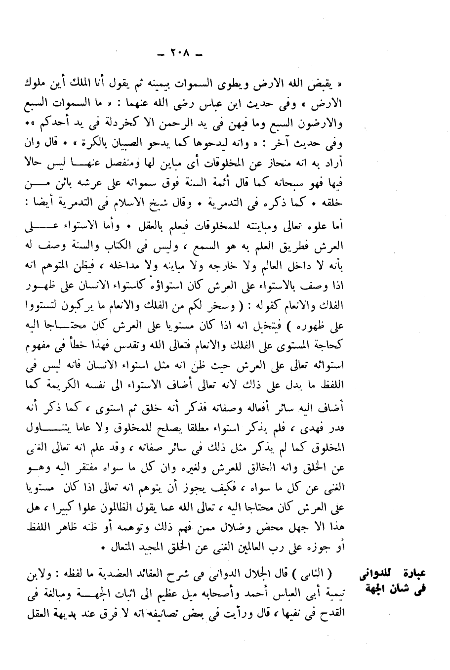 (الثَّانِي) قَالَ الْجَلَالُ الدَّوَانِيُّ فِي شَرْحِ الْعَقَائِدِ الْعَضُدِيَّةِ مَا لَفْظُهُ: وَلِابْنِ تَيْمِيَّةَ أَبِي الْعَبَّاسِ أَحْمَدَ وَأَصْحَابِهِ مَيْلٌ عَظِيمٌ إِلَى إِثْبَاتِ الْجِهَةِ، وَمُبَالَغَةٍ فِي الْقَدْحِ فِي نَفْيِهَا، قَالَ: وَرَأَيْتُ فِي بَعْضِ تَصَانِيفِهِ أَنَّهُ لَا فَرْقَ عِنْدَ بَدِيهَةِ الْعَقْلِ