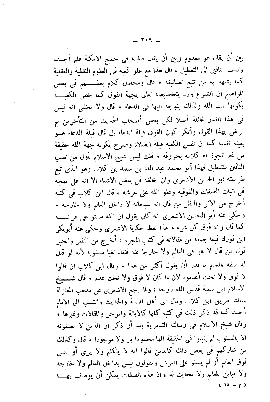 بَيْنَ أَنْ يُقَالَ هُوَ مَعْدُومٌ، وَبَيْنَ أَنْ يُقَالَ طَلَبْتُهُ فِي جَمِيعِ الْأَمْكِنَةِ فَلَمْ أَجِدْهُ، وَنَسَبَ النَّافِينَ إِلَى التَّعْطِيلِ، قَالَ هَذَا مَعَ عُلُوِّ كَعْبِهِ فِي الْعُلُومِ النَّقْلِيَّةِ وَالْعَقْلِيَّةِ، كَمَا يَشْهَدُ بِهِ مَنْ تَتَّبَعَ تَصَانِيفَهُ، قَالَ: وَمُحَصِّلُ كَلَامِ بَعْضِهِمْ فِي بَعْضِ الْمَوَاضِعِ أَنَّ الشَّرْعَ وَرَدَ بِتَخْصِيصِهِ تَعَالَى بِجِهَةِ الْفَوْقِ كَمَا خَصَّ الْكَعْبَةَ بِكَوْنِهَا بَيْتَ اللَّهِ لِذَلِكَ يَتَوَجَّهُ إِلَيْهَا فِي الدُّعَاءِ، قَالَ: وَلَا يَخْفَى إِنَّهُ لَيْسَ فِي هَذَا الْقَدْرِ غَائِلَةٌ أَصْلًا، لَكِنَّ بَعْضَ أَصْحَابِ الْحَدِيثِ مِنَ الْمُتَأَخِّرِينَ لَمْ يَرْضَ بِهَذَا الْقَوْلِ، وَأَنْكَرَ كَوْنَ الْفَوْقِ قَبْلَ الدُّعَاءِ، بَلْ قَالَ قِبْلَةُ الدُّعَاءِ هُوَ بِعَيْنِهِ نَفْسُهُ، كَمَا أَنَّ نَفْسَ الْكَعْبَةِ قِبْلَةُ الصَّلَاةِ، وَصَرَّحَ بِكَوْنِهِ جِهَةَ اللَّهِ حَقِيقَةً مِنْ غَيْرِ تَجَوُّزٍ. اه كَلَامُهُ بِحُرُوفِهِ.