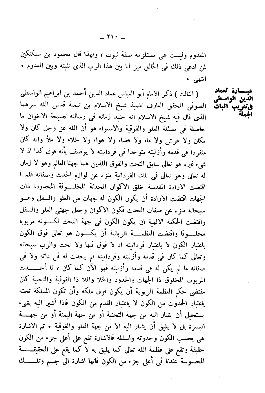 (الثَّالِثُ) ذَكَرَ الْإِمَامُ أَبُو الْعَبَّاسِ عِمَادُ الدِّينِ أَحْمَدُ بْنُ إِبْرَاهِيمَ الْوَاسِطِيُّ الصُّوفِيُّ الْمُحَقِّقُ الْعَارِفُ، تِلْمِيذُ شَيْخِ الْإِسْلَامِ ابْنِ تَيْمِيَّةَ - قَدَّسَ اللَّهُ سِرَّهُمَا، الَّذِي قَالَ فِيهِ شَيْخُ الْإِسْلَامِ: إِنَّهُ جُنَيْدُ زَمَانِهِ - فِي رِسَالَتِهِ نَصِيحَةِ الْإِخْوَانِ مَا حَاصِلُهُ فِي مَسْأَلَةِ الْعُلُوِّ وَالْفَوْقِيَّةِ وَالِاسْتِوَاءِ، هُوَ أَنَّ اللَّهَ عَزَّ وَجَلَّ كَانَ وَلَا مَكَانَ، وَلَا عَرْشَ، وَلَا مَاءَ، وَلَا فَضَاءَ، وَلَا هَوَاءَ، وَلَا خَلَاءَ، وَلَا مَلَأَ، وَإِنَّهُ كَانَ مُنْفَرِدًا فِي قِدَمِهِ وَأَزَلِيَّتِهِ، مُتَوَحِّدًا فِي فَرْدَانِيَّتِهِ، لَا يُوصَفُ بِأَنَّهُ فَوْقَ كَذَا إِذَا لَا شَيْءَ غَيْرُهُ، هُوَ تَعَالَى سَبَقَ التَّحْتَ وَالْفَوْقَ اللَّذَيْنِ هُمَا جِهَتَا الْعَالَمِ، وَهُوَ لَا زَمَانَ لَهُ تَعَالَى، هُوَ تَعَالَى فِي تِلْكَ الْفَرْدَانِيَّةِ مُنَزَّهٌ عَنْ لَوَازِمِ الْحَدَثِ وَصِفَاتِهِ، فَلَمَّا اقْتَضَتِ الْإِرَادَةُ الْمُقَدَّسَةُ خَلْقَ الْأَكْوَانِ وَجَعْلَ جِهَتِي الْعُلُوِّ وَالسُّفْلِ، وَاقْتَضَتِ الْحِكْمَةُ الْإِلَهِيَّةُ أَنْ يَكُونَ الْكَوْنُ فِي جِهَةِ التَّحْتِ لِكَوْنِهِ مَرْبُوبًا مَخْلُوقًا، وَاقْتَضَتِ الْعَظَمَةُ الرَّبَّانِيَّةُ أَنْ يَكُونَ هُوَ تَعَالَى فَوْقَ الْكَوْنِ بِاعْتِبَارِ الْكَوْنِ لَا بِاعْتِبَارِ فَرْدَانِيَّتِهِ، إِذَا لَا فَوْقَ فِيهَا وَلَا تَحْتَ، وَالرَّبُّ سُبْحَانَهُ وَتَعَالَى كَمَا كَانَ فِي قِدَمِهِ وَأَزَلِيَّتِهِ وَفَرْدَانِيَّتِهِ لَمْ يَحْدُثْ لَهُ فِي ذَاتِهِ، وَلَا فِي صِفَاتِهِ مَا لَمْ يَكُنْ لَهُ فِي قِدَمِهِ وَأَزَلِيَّتِهِ فَهُوَ الْآنَ كَمَا كَانَ، لَمَّا أَحْدَثَ الْمَرْبُوبَ الْمَخْلُوقَ ذَا الْجِهَاتِ وَالْحُدُودِ، وَالْخَلَا وَالْمَلَا، ذَا الْفَوْقِيَّةِ وَالتَّحْتِيَّةِ، كَانَ مُقْتَضَى حُكْمِ الْعَظَمَةِ الرَّبَوِيَّةِ أَنْ يَكُونَ فَوْقَ مُلْكِهِ، وَأَنْ تَكُونَ الْمَمْلَكَةُ تَحْتَهُ بِاعْتِبَارِ الْحُدُوثِ مِنَ الْكَوْنِ لَا بِاعْتِبَارِ الْقِدَمِ مِنَ الْمُكَوِّنِ، فَإِذَا أُشِيرَ إِلَيْهِ بِشَيْءٍ يَسْتَحِيلُ أَنْ يُشَارَ مِنْ جِهَةِ التَّحْتِيَّةِ أَوْ مِنْ جِهَةِ الْيَمْنَةِ أَوْ مِنْ جِهَةِ الْيَسْرَةِ بَلْ لَا يَلِيقُ أَنْ يُشَارَ إِلَيْهِ إِلَّا مِنْ جِهَةِ الْعُلُوِّ وَالْفَوْقِيَّةِ، ثُمَّ الْإِشَارَةُ هِيَ بِحَسَبِ الْكَوْنِ وَحُدُوثِهِ وَأَسْفَلِهِ فَالْإِشَارَةُ تَقَعُ عَلَى أَعْلَى جُزْءٍ مِنَ الْكَوْنِ حَقِيقَةً، وَتَقَعُ عَلَى عَظَمَةِ اللَّهِ تَعَالَى كَمَا يَلِيقُ بِهِ لَا كَمَا يَقَعُ عَلَى الْحَقِيقَةِ الْمَحْسُوسَةِ عِنْدَنَا فِي أَعْلَى جُزْءٍ مِنَ الْكَوْنِ فَإِنَّهَا إِشَارَةٌ إِلَى جِسْمٍ وَتِلْكَ