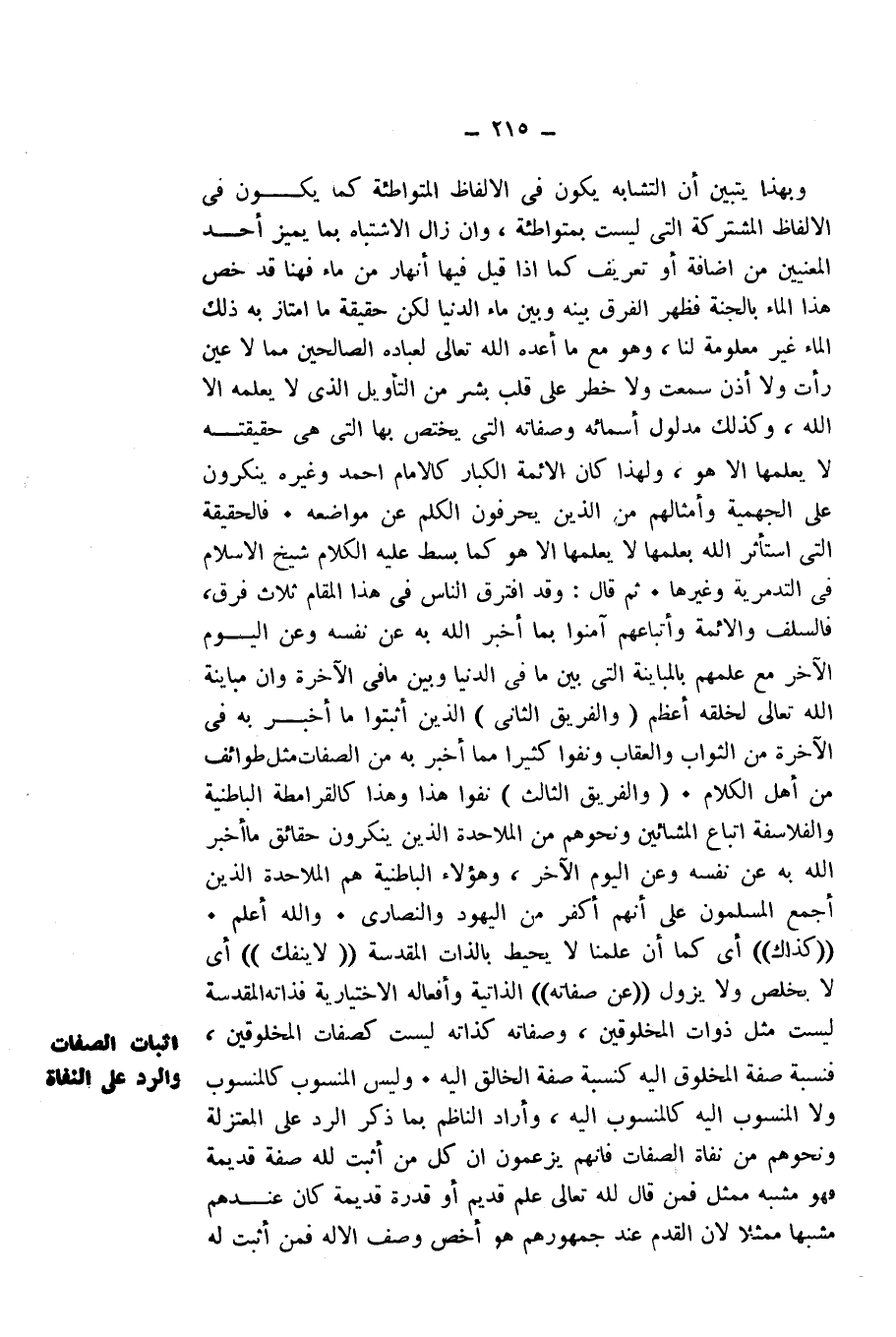 (وَالْفَرِيقُ الثَّانِي) الَّذِينَ أَثْبَتُوا مَا أَخْبَرَ بِهِ فِي الْآخِرَةِ مِنَ الثَّوَابِ وَالْعِقَابِ وَنَفَوْا كَثِيرًا مِمَّا أَخْبَرَ بِهِ مِنَ الصِّفَاتِ مِثْلَ طَوَائِفَ مِنْ أَهْلِ الْكَلَامِ.