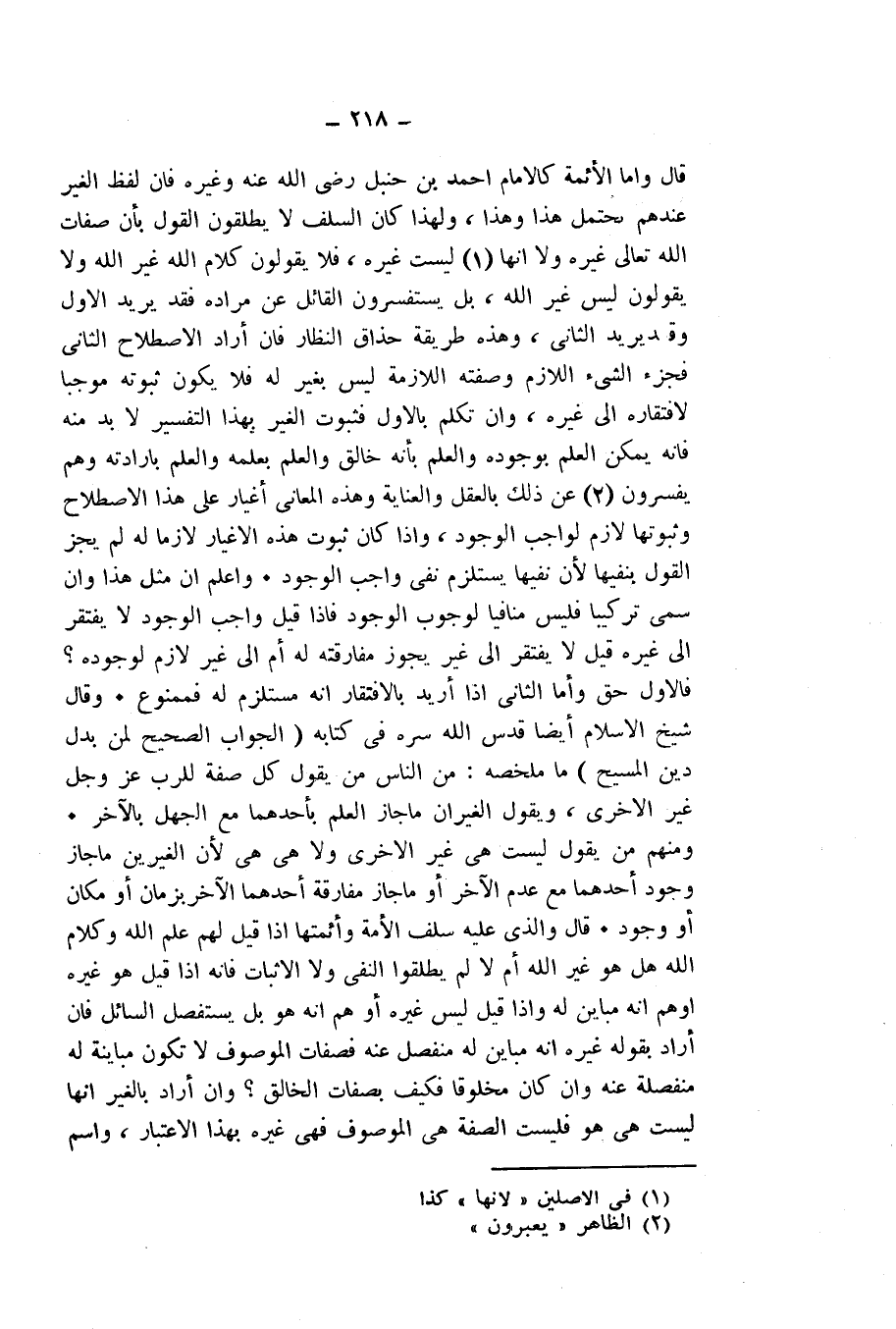قَالَ: وَأَمَّا الْأَئِمَّةُ كَالْإِمَامِ أَحْمَدَ بْنِ حَنْبَلٍ - رَضِيَ اللَّهُ عَنْهُ - وَغَيْرِهِ، فَإِنَّ لَفْظَ الْغَيْرِ عِنْدَهُمْ يَحْتَمِلُ هَذَا وَهَذَا، وَلِهَذَا كَانَ السَّلَفُ لَا يُطْلِقُونَ الْقَوْلَ بِأَنَّ صِفَاتَ اللَّهِ تَعَالَى غَيْرُهُ، وَلَا أَنَّهَا لَيْسَتْ غَيْرَهُ، فَلَا يَقُولُونَ كَلَامُ اللَّهِ غَيْرُ اللَّهِ، وَلَا يَقُولُونَ لَيْسَ غَيْرَ اللَّهِ، بَلْ يَسْتَفْسِرُونَ الْقَائِلَ عَنْ مُرَادِهِ فَقَدْ يُرِيدُ الْأَوَّلَ وَقَدْ يُرِيدُ الثَّانِيَ، وَهَذِهِ طَرِيقَةُ حُذَّاقِ النُّظَّارِ، فَإِنْ أَرَادَ الِاصْطِلَاحَ الثَّانِيَ فَجُزْءُ الشَّيْءِ اللَّازِمِ وَصِفَتُهُ اللَّازِمَةُ لَيْسَ بِغَيْرٍ لَهُ، فَلَا يَكُونُ ثُبُوتُهُ مُوجِبًا لِافْتِقَارِهِ إِلَى غَيْرِهِ، وَإِنْ تَكَلَّمَ بِالْأَوَّلِ فَثُبُوتُ الْغَيْرِ بِهَذَا التَّفْسِيرِ، لَا بُدَّ مِنْهُ فَإِنَّهُ يُمْكِنُ الْعِلْمُ بِوُجُودِهِ، وَالْعِلْمُ بِأَنَّهُ خَالِقٌ، وَالْعِلْمُ بِعِلْمِهِ، وَالْعِلْمُ بِإِرَادَتِهِ، وَهُمْ يُفَسِّرُونَ عَنْ ذَلِكَ بِالْعَقْلِ وَالْعِنَايَةِ، وَهَذِهِ الْمَعَانِي أَغْيَارٌ عَلَى هَذَا الِاصْطِلَاحِ، وَثُبُوتُهَا لَازِمٌ لِوَاجِبِ الْوُجُودِ، وَإِذَا كَانَ ثُبُوتُ هَذِهِ الْأَغْيَارِ لَازِمًا لَهُ لَمْ يَجُزِ الْقَوْلُ بِنَفْيِهَا لِأَنَّ نَفْيَهَا يَسْتَلْزِمُ نَفْيَ وَاجِبِ الْوُجُودِ.