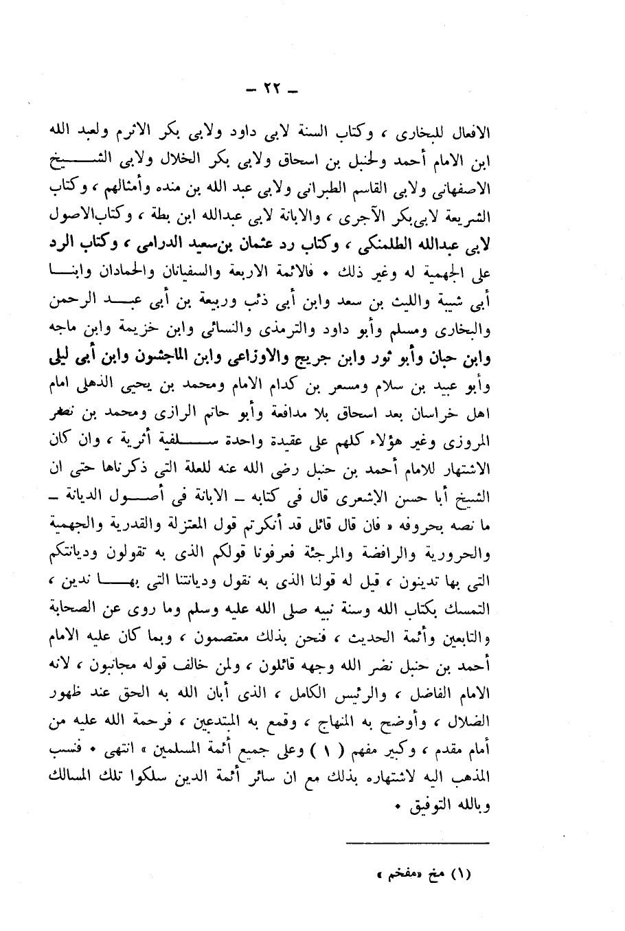 الْأَفْعَالِ لِلْبُخَارِيِّ، وَكِتَابِ السُّنَّةِ لِأَبِي دَاوُدَ، وَلِأَبِي بَكْرٍ الْأَثْرَمِ، وَلِعَبْدِ اللَّهِ ابْنِ الْإِمَامِ أَحْمَدَ، وَلِحَنْبَلِ بْنِ إِسْحَاقَ، وَلِأَبِي بَكْرٍ الْخَلَّالِ، وَلِأَبِي الشَّيْخِ الْأَصْفَهَانِيِّ، وَلِأَبِي الْقَاسِمِ الطَّبَرَانِيِّ، وَلِأَبِي عَبْدِ اللَّهِ بْنِ مَنْدَهْ وَأَمْثَالِهِمْ، وَكِتَابِ الشَّرِيعَةِ لِأَبِي بَكْرٍ الْآجُرِّيِّ، وَالْإِبَانَةِ لِأَبِي عَبْدِ اللَّهِ ابْنِ بَطَّةَ، وَكِتَابِ الْأُصُولِ لِأَبِي عَبْدِ اللَّهِ الطَّلَمَنْكِيِّ، وَكِتَابِ رَدِّ عُثْمَانَ بْنِ سَعِيدٍ الدَّارِمِيِّ، وَكِتَابِ الرَّدِّ عَلَى الْجَهْمِيَّةِ لَهُ وَغَيْرِ ذَلِكَ. فَالْأَئِمَّةُ الْأَرْبَعَةُ وَالسُّفْيَانَانِ وَالْحَمَّادَانِ وَابْنَا أَبِي شَيْبَةَ وَاللَّيْثُ بْنُ سَعْدٍ وَابْنُ أَبِي ذِئْبٍ وَرَبِيعَةُ بْنُ أَبِي عَبْدِ الرَّحْمَنِ وَالْبُخَارِيُّ وَمُسْلِمٌ وَأَبُو دَاوُدَ وَالتِّرْمِذِيُّ وَالنَّسَائِيُّ وَابْنُ خُزَيْمَةَ، وَابْنُ مَاجَهْ وَابْنُ حِبَّانَ، وَأَبُو ثَوْرٍ وَابْنُ جُرَيْجٍ، وَالْأَوْزَاعِيُّ وَابْنُ الْمَاجِشُونِ، وَابْنُ أَبِي لَيْلَى، وَأَبُو عُبَيْدِ بْنُ سَلَّامٍ، وَمِسْعَرُ بْنُ كِدَامٍ الْإِمَامُ، وَمُحَمَّدُ بْنُ يَحْيَى الذُّهْلِيُّ إِمَامُ أَهْلِ خُرَاسَانَ بَعْدَ إِسْحَاقَ بِلَا مُدَافَعَةٍ، وَأَبُو حَاتِمٍ الرَّازِيُّ، وَمُحَمَّدُ بْنُ نَصْرٍ الْمَرْوَزِيُّ، وَغَيْرُ هَؤُلَاءِ كُلُّهُمْ عَلَى عَقِيدَةٍ وَاحِدَةٍ سَلَفِيَّةٍ أَثَرِيَّةٍ، وَإِنْ كَانَ الِاشْتِهَارُ لِلْإِمَامِ أَحْمَدَ بْنِ حَنْبَلٍ - رَضِيَ اللَّهُ عَنْهُ - لِلْعِلَّةِ الَّتِي ذَكَرْنَاهَا، حَتَّى إِنَّ الشَّيْخَ أَبَا حَسَنٍ الْأَشْعَرِيَّ قَالَ فِي كِتَابِهِ - الْإِبَانَةِ فِي أُصُولِ الدِّيَانَةِ - مَا نَصُّهُ بِحُرُوفِهِ: " فَإِنْ قَالَ قَائِلٌ: قَدْ أَنْكَرْتُمْ قَوْلَ الْمُعْتَزِلَةِ وَالْقَدَرِيَّةِ وَالْجَهْمِيَّةِ وَالْحَرُورِيَّةِ وَالرَّافِضَةِ وَالْمُرْجِئَةِ، فَعَرِّفُونَا قَوْلَكُمُ الَّذِي بِهِ تَقُولُونَ، وَدِيَانَتَكُمُ الَّتِي بِهَا تَدِينُونَ، قِيلَ لَهُ: قَوْلُنَا الَّذِي بِهِ نَقُولُ، وَدِيَانَتُنَا الَّتِي بِهَا نَدِينُ، التَّمَسُّكُ بِكِتَابِ اللَّهِ وَسُنَّةِ نَبِيِّهِ - صَلَّى اللَّهُ عَلَيْهِ وَسَلَّمَ - وَمَا رُوِيَ عَنِ الصَّحَابَةِ وَالتَّابِعِينَ وَأَئِمَّةِ الْحَدِيثِ، فَنَحْنُ بِذَلِكَ مُعْتَصِمُونَ، وَبِمَا كَانَ عَلَيْهِ الْإِمَامُ أَحْمَدُ بْنُ حَنْبَلٍ - نَضَّرَ اللَّهُ وَجْهَهُ - قَائِلُونَ، وَلِمَنْ خَالَفَ قَوْلَهُ مُجَانِبُونَ ; لِأَنَّهُ الْإِمَامُ الْفَاضِلُ، وَالرَّئِيسُ الْكَامِلُ، الَّذِي أَبَانَ اللَّهُ بِهِ الْحَقَّ عِنْدَ ظُهُورِ الضَّلَالِ، وَأَوْضَحَ بِهَا الْمِنْهَاجَ، وَقَمَعَ بِهِ الْمُبْتَدِعِينَ، فَرَحْمَةُ اللَّهِ عَلَيْهِ مِنْ إِمَامٍ مُقَدَّمٍ، وَكَبِيرٍ مُفَهَّمٍ، وَعَلَى جَمِيعِ أَئِمَّةِ الْمُسْلِمِينَ ". انْتَهَى. فَنَسَبَ الْمَذْهَبَ إِلَيْهِ لِاشْتِهَارِهِ بِذَلِكَ، مَعَ أَنَّ سَائِرَ أَئِمَّةِ الدِّينِ سَلَكُوا تِلْكَ الْمَسَالِكَ، وَبِاللَّهِ التَّوْفِيقُ.