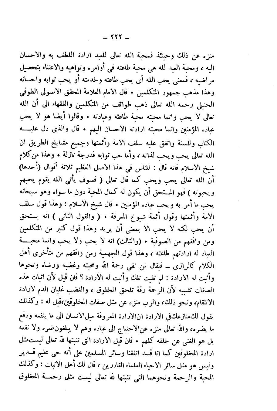 قَالَ الْإِمَامُ الْعَلَّامَةُ الْمُحَقِّقُ الْأُصُولِيُّ الطَّوْفَيُّ الْحَنْبَلِيُّ - رَحِمَهُ اللَّهِ تَعَالَى - ذَهَبَ طَوَائِفُ مِنَ الْمُتَكَلِّمِينَ وَالْفُقَهَاءِ إِلَى أَنَّ اللَّهَ تَعَالَى لَا يُحِبُّ، وَإِنَّمَا مَحَبَّتُهُ مَحَبَّةُ طَاعَتِهِ وَعِبَادَتِهِ. وَقَالُوا أَيْضًا: هُوَ لَا يُحِبُّ عِبَادَهُ الْمُؤْمِنِينَ، وَإِنَّمَا مَحَبَّتُهُ إِرَادَتُهُ الْإِحْسَانَ إِلَيْهِمْ.