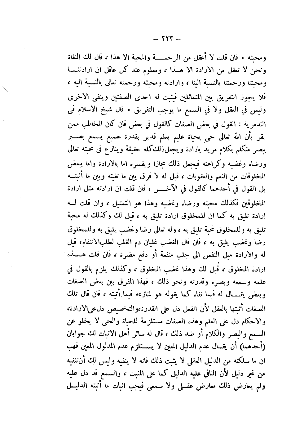 وَمَحَبَّتِهِ. فَإِنْ قُلْتَ: لَا أَعْقِلُ مِنَ الرَّحْمَةِ وَالْمَحَبَّةِ إِلَّا هَذَا، قَالَ لَكَ النُّفَاةُ: وَنَحْنُ لَا نَعْقِلُ مِنَ الْإِرَادَةِ إِلَّا هَذَا، وَمَعْلُومٌ عِنْدَ كُلِّ عَاقِلٍ أَنَّ إِرَادَتَنَا وَمَحَبَّتَنَا وَرَحْمَتَنَا بِالنِّسْبَةِ إِلَيْنَا، وَإِرَادَتَهُ وَمَحَبَّتَهُ وَرَحْمَتَهُ تَعَالَى بِالنِّسْبَةِ إِلَيْهِ، فَلَا يَجُوزُ التَّفْرِيقُ بَيْنَ الْمُتَمَاثِلِينَ فَيُثْبِتُ لَهُ إِحْدَى الصِّفَتَيْنِ وَيَنْفِي الْأُخْرَى، وَلَيْسَ فِي الْعَقْلِ وَلَا فِي السَّمْعِ مَا يُوجِبُ التَّفْرِيقَ.
