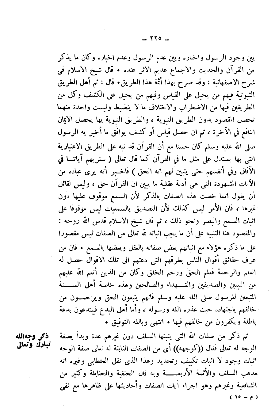 ثُمَّ ذَكَرَ مِنْ صِفَاتِ اللَّهِ الَّتِي يُثْبِتُهَا السَّلَفُ دُونَ غَيْرِهِمْ عِدَّةً وَبَدَأَ بِصِفَةِ الْوَجْهِ لَهُ تَعَالَى فَقَالَ: ((كَوَجْهِهِ)) أَيْ مِنَ الصِّفَاتِ الثَّابِتَةِ لَهُ تَعَالَى صِفَةُ الْوَجْهِ إِثْبَاتَ وُجُودٍ لَا إِثْبَاتَ تَكْيِيفٍ وَتَحْدِيدٍ، وَهَذَا الَّذِي نَقَلَ الْخَطَابِيُّ وَغَيْرُهُ أَنَّهُ مَذْهَبُ السَّلَفِ وَالْأَئِمَّةِ الْأَرْبَعَةِ، وَبِهِ قَالَ الْحَنَفِيَّةُ وَالْحَنَابِلَةُ وَكَثِيرٌ مِنَ الشَّافِعِيَّةِ وَغَيْرِهِمْ وَهُوَ إِجْرَاءُ آيَاتِ الصِّفَاتِ وَأَحَادِيثِهَا عَلَى ظَاهِرِهَا مَعَ نَفْيِ