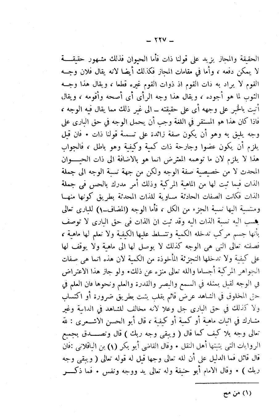 وَلَوْ جَازَ هَذَا الِاعْتِرَاضُ فِي الْوَجْهِ لَقِيلَ بِمِثْلِهِ فِي السَّمْعِ وَالْبَصَرِ وَالْقُدْرَةِ وَالْعِلْمِ وَنَحْوِهَا، فَإِنَّ الْعِلْمَ فِي حَقِّ الْمَخْلُوقِ فِي الشَّاهِدِ عَرَضٌ قَائِمٌ بِقَلْبٍ يَثْبُتُ بِطَرِيقِ ضَرُورَةٍ أَوِ اكْتَسَابٍ مُشَارِكٍ فِي إِثْبَاتِ مَاهِيَّةٍ أَوْ كَمِّيَّةٍ أَوْ كَيْفِيَّةٍ.