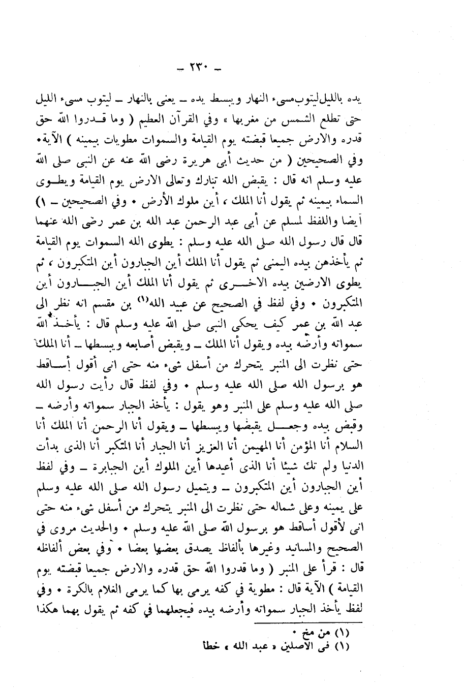 وَالْحَدِيثُ مَرْوِيٌّ فِي الصَّحِيحِ وَالْمَسَانِيدِ وَغَيْرِهَا بِأَلْفَاظٍ يُصَدِّقُ بَعْضُهَا بَعْضًا. وَفِي بَعْضِ أَلْفَاظِهِ قَالَ: «قَرَأَ عَلَى الْمِنْبَرِ (وَمَا قَدَرُوا اللَّهَ حَقَّ قَدْرِهِ وَالْأَرْضُ جَمِيعًا قَبْضَتُهُ يَوْمَ الْقِيَامَةِ) الْآيَةَ قَالَ: مَطْوِيَّةٌ فِي كَفِّهِ يَرْمِي بِهَا كَمَا يَرْمِي الْغُلَامُ بِالْكُرَةِ» ، وَفِي لَفْظٍ: «يَأْخُذُ الْجَبَّارُ سَمَاوَاتِهِ وَأَرْضَهُ بِيَدِهِ فَيَجْعَلُهَا فِي كَفِّهِ ثُمَّ يَقُولُ بِهِمَا هَكَذَا
