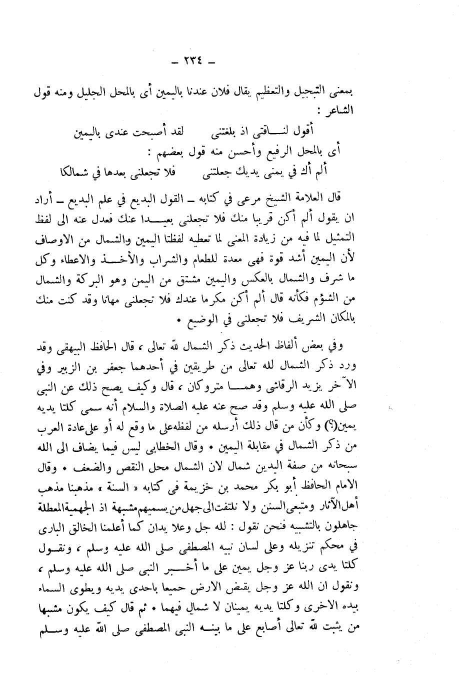 وَقَالَ الْخَطَّابِيُّ: لَيْسَ فِيمَا يُضَافُ إِلَى اللَّهِ سُبْحَانَهُ مِنْ صِفَةِ الْيَدَيْنِ شِمَالٌ، لِأَنَّ الشِّمَالَ مَحَلُّ النَّقْصِ وَالضَّعْفِ، وَقَالَ الْإِمَامُ الْحَافِظُ أَبُو بَكْرٍ مُحَمَّدُ بْنُ خُزَيْمَةَ فِي كِتَابِهِ " السُّنَّةِ ": مَذْهَبُنَا مَذْهَبُ أَهْلِ الْآثَارِ، وَمُتَّبِعِي السُّنَنِ، وَلَا نَلْتَفِتُ إِلَى جَهْلِ مَنْ يُسَمِّيهِمْ مُشَبِّهَةً، إِذِ الْجَهْمِيَّةُ الْمُعَطِّلَةُ جَاهِلُونَ بِالتَّشْبِيهِ، فَنَحْنُ نَقُولُ: لِلَّهِ جَلَّ وَعَلَا يَدَانِ كَمَا أَعْلَمَنَا الْخَالِقُ الْبَارِي فِي مُحْكَمِ تَنْزِيلِهِ، وَعَلَى لِسَانِ نَبِيِّهِ الْمُصْطَفَى - صَلَّى اللَّهُ عَلَيْهِ وَسَلَّمَ -، وَنَقُولُ كِلْتَا يَدَيْ رَبِّنَا عَزَّ وَجَلَّ يَمِينٌ عَلَى مَا أَخْبَرَ النَّبِيُّ - صَلَّى اللَّهُ عَلَيْهِ وَسَلَّمَ -، وَنَقُولُ إِنَّ اللَّهَ عَزَّ وَجَلَّ يَقْبِضُ الْأَرْضَ جَمِيعًا بِإِحْدَى يَدَيْهِ وَيَطْوِي السَّمَاءَ بِيَدِهِ الْأُخْرَى وَكِلْتَا يَدَيْهِ يَمِينَانِ لَا شِمَالَ فِيهِمَا.