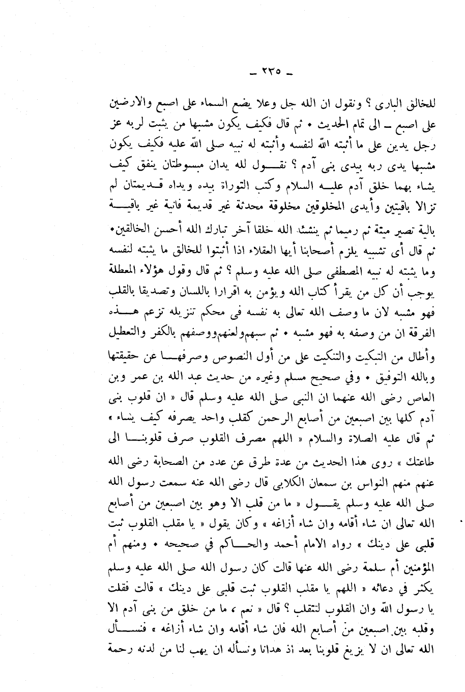 وَفِي صَحِيحِ مُسْلِمٍ وَغَيْرِهِ مِنْ حَدِيثِ عَبْدِ اللَّهِ بْنِ عَمْرِو بْنِ الْعَاصِ - رَضِيَ اللَّهُ عَنْهُمَا - أَنَّ النَّبِيَّ - صَلَّى اللَّهُ عَلَيْهِ وَسَلَّمَ - قَالَ " «إِنَّ قُلُوبَ بَنِي آدَمَ كُلَّهَا بَيْنَ أُصْبُعَيْنِ مِنْ أَصَابِعِ الرَّحْمَنِ، كَقَلْبٍ وَاحِدٍ يُصَرِّفُهُ كَيْفَ يَشَاءُ» " «ثُمَّ قَالَ عَلَيْهِ الصَّلَاةُ وَالسَّلَامُ " اللَّهُمَّ مُصَرِّفَ الْقُلُوبِ، صَرِّفْ قُلُوبَنَا إِلَى طَاعَتِكَ» ".
