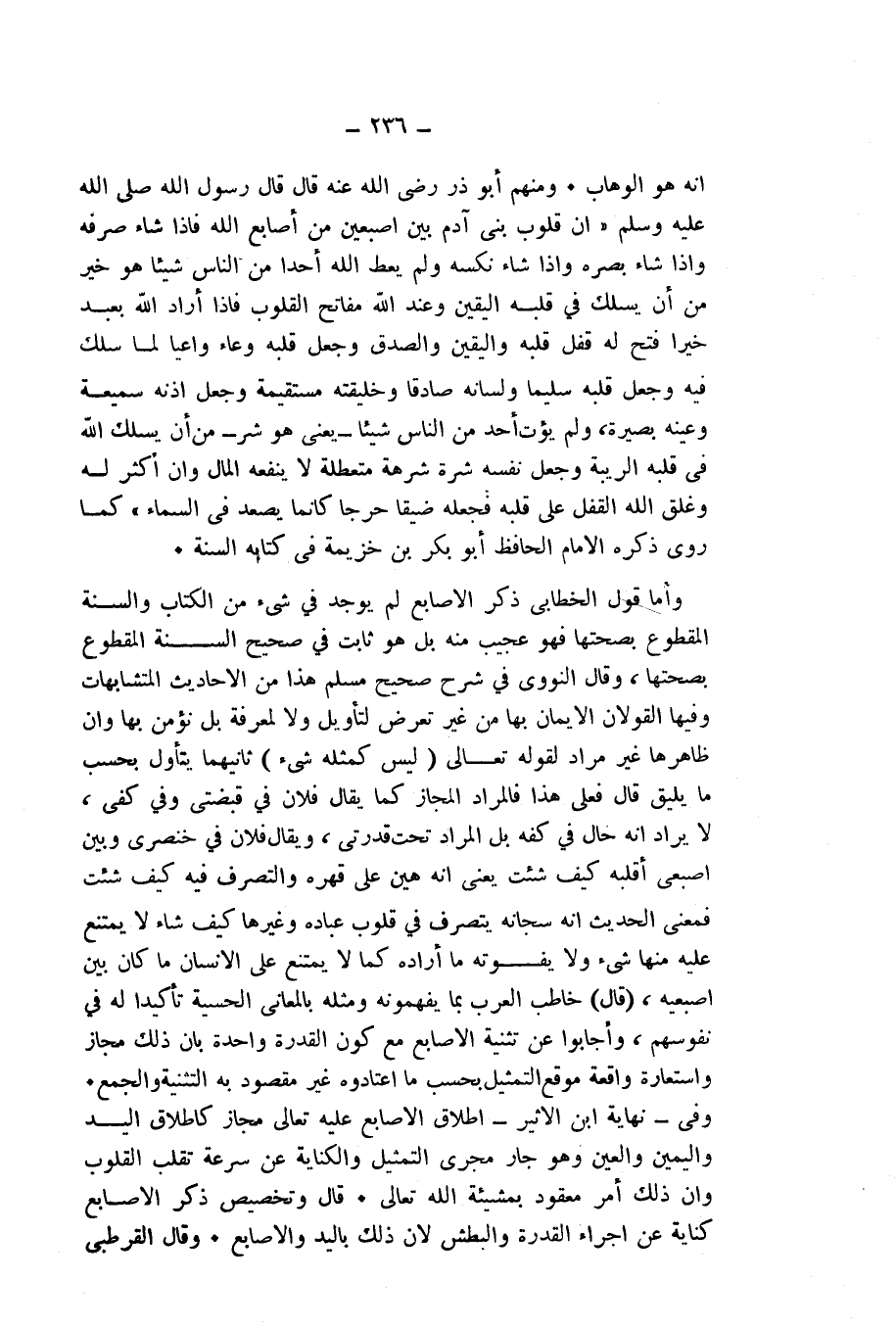 وَأَمَّا قَوْلُ الْخَطَّابِيِّ: ذِكْرُ الْأَصَابِعِ لَمْ يُوجَدْ فِي شَيْءٍ مِنَ الْكِتَابِ وَالسُّنَّةِ الْمَقْطُوعِ بِصِحَّتِهَا، فَهُوَ عَجِيبٌ مِنْهُ، بَلْ هُوَ ثَابِتٌ فِي صَحِيحِ السُّنَّةِ الْمَقْطُوعِ بِصِحَّتِهَا، وَقَالَ النَّوَوِيُّ فِي شَرْحِ صَحِيحِ مُسْلِمٍ: هَذَا مِنَ الْأَحَادِيثِ الْمُتَشَابِهَاتِ: وَفِيهَا الْقَوْلَانِ: الْإِيمَانُ بِهَا مِنْ غَيْرِ تَعَرُّضٍ لِتَأْوِيلٍ وَلَا لِمَعْرِفَةٍ بَلْ نُؤْمِنُ بِهَا، وَأَنَّ ظَاهِرَهَا غَيْرُ مُرَادٍ لِقَوْلِهِ تَعَالَى {لَيْسَ كَمِثْلِهِ شَيْءٌ} [الشورى: 11] ، ثَانِيهُمَا: يَتَأَوَّلُ بِحَسَبِ مَا يَلِيقُ، قَالَ فَعَلَى هَذَا فَالْمُرَادُ الْمَجَازُ كَمَا يُقَالُ: فُلَانٌ فِي قَبْضَتِي، وَفِي كَفِّي. لَا يُرَادُ أَنَّهُ حَالٌّ فِي كَفِّهِ بَلِ الْمُرَادُ تَحْتَ قُدْرَتِي.