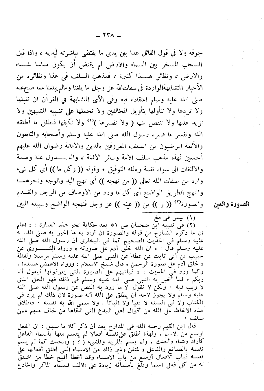 وَإِذَا قِيلَ السَّحَابُ الْمُسَخَّرُ بَيْنَ السَّمَاءِ وَالْأَرْضِ، لَمْ يَقْتَضِ أَنَّ يَكُونَ مُمَاسًّا لِلسَّمَاءِ وَالْأَرْضِ، وَنَظَائِرُ هَذَا كَثِيرَةٌ، فَمَذْهَبُ السَّلَفِ فِي هَذَا وَنَظَائِرُهُ مِنَ الْأَخْبَارِ الْمُتَشَابِهَةِ الْوَارِدَةِ فِي صِفَاتِ اللَّهِ عَزَّ وَجَلَّ مَا بَلَغَنَا، وَمَا لَمْ يَبْلُغْنَا مِمَّا صَحَّ عَنْهُ - صَلَّى اللَّهُ عَلَيْهِ وَسَلَّمَ - اعْتِقَادُنَا فِيهِ، وَفِي الْآيِ الْمُتَشَابِهَةِ فِي الْقُرْآنِ أَنْ نَقْبَلَهَا وَلَا نَرُدَّهَا، وَلَا نَتَأَوَّلَهَا بِتَأْوِيلِ الْمُخَالِفِينَ، وَلَا نَحْمِلُهَا عَلَى تَشْبِيهِ الْمُشَبِّهِينَ، وَلَا نَزِيدُ عَلَيْهَا، وَلَا نَنْقُصُ مِنْهَا (وَلَا نُفَسِّرُهَا) وَلَا نُكَيِّفُهَا، فَنُطْلِقُ مَا أَطْلَقَهُ اللَّهُ، وَنُفَسِّرُ مَا فَسَّرَهُ رَسُولُ اللَّهِ - صَلَّى اللَّهُ عَلَيْهِ وَسَلَّمَ - وَأَصْحَابُهُ، وَالتَّابِعُونَ، وَالْأَئِمَّةُ الْمَرْضِيُّونَ مِنَ السَّلَفِ الْمَعْرُوفِينَ بِالدِّينِ وَالْأَمَانَةِ - رِضْوَانُ اللَّهِ عَلَيْهِمْ أَجْمَعِينَ - فَهَذَا مَذْهَبُ سَلَفِ الْأُمَّةِ، وَسَائِرِ الْأَئِمَّةِ، وَالْعُدُولُ عَنْهُ وَصْمَةٌ، وَالِالْتِفَاتُ إِلَى سِوَاهُ نِقْمَةٌ، وَبِاللَّهِ التَّوْفِيقُ.