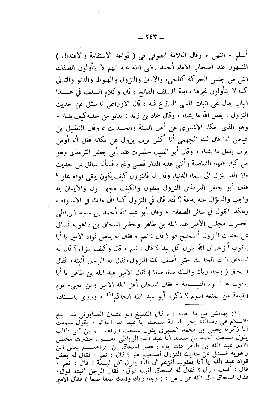 وَقَالَ الْعَلَامَةَ الطَّوْفِيُّ فِي (قَوَاعِدِ الِاسْتِقَامَةِ وَالِاعْتِدَالِ) : الْمَشْهُورُ عِنْدَ أَصْحَابِ الْإِمَامِ أَحْمَدَ - رَضِيَ اللَّهُ عَنْهُ - أَنَّهُمْ لَا يَتَأَوَّلُونَ الصِّفَاتَ الَّتِي مِنْ جِنْسِ الْحَرَكَةِ، كَالْمَجِيءِ وَالْإِتْيَانِ وَالنُّزُولِ وَالْهُبُوطِ وَالدُّنُوِّ وَالتَّدَلِّي، كَمَا لَا يَتَأَوَّلُونَ غَيْرَهَا مُتَابَعَةً لِلسَّلَفِ الصَّالِحِ، وَقَالَ: وَكَلَامُ السَّلَفِ فِي هَذَا الْبَابِ يَدُلُّ عَلَى إِثْبَاتِ الْمَعْنَى الْمُتَنَازَعِ فِيهِ، وَقَالَ الْأَوْزَاعِيُّ لَمَّا سُئِلَ عَنْ حَدِيثِ النُّزُولِ: يَفْعَلُ اللَّهُ مَا يَشَاءُ. وَقَالَ حَمَّادُ بْنُ زَيْدٍ: يَدْنُو مِنْ خَلْقِهِ كَيْفَ يَشَاءُ.