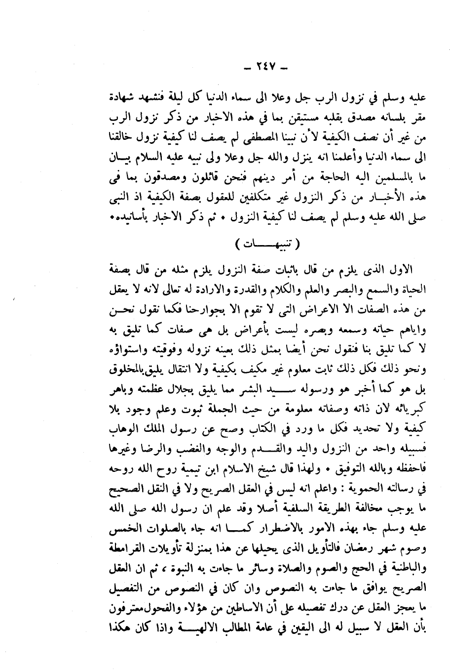وَلِهَذَا قَالَ شَيْخُ الْإِسْلَامِ ابْنُ تَيْمِيَّةَ - رَوَّحَ اللَّهُ رُوحَهُ - فِي رِسَالَتِهِ الْحَمَوِيَّةِ: وَاعْلَمْ أَنَّهُ لَيْسَ فِي الْعَقْلِ الصَّرِيحِ، وَلَا فِي النَّقْلِ الصَّحِيحِ مَا يُوجِبُ مُخَالَفَةَ الطَّرِيقَةِ السَّلَفِيَّةِ أَصْلًا، وَقَدْ عُلِمَ أَنَّ رَسُولَ اللَّهِ - صَلَّى اللَّهُ عَلَيْهِ وَسَلَّمَ - جَاءَ بِهَذِهِ الْأُمُورِ بِالِاضْطِرَارِ، كَمَا أَنَّهُ جَاءَ بِالصَّلَوَاتِ الْخَمْسِ، وَصَوْمِ شَهْرِ رَمَضَانَ، فَالتَّأْوِيلُ الَّذِي يُحِيلُهَا عَنْ هَذَا بِمَنْزِلَةِ تَأْوِيلَاتِ الْقَرَامِطَةِ وَالْبَاطِنِيَّةِ فِي الْحَجِّ وَالصَّوْمِ وَالصَّلَاةِ وَسَائِرِ مَا جَاءَتْ بِهِ النُّبُوَّةُ، ثُمَّ إِنَّ الْعَقْلَ الصَّرِيحَ يُوَافِقُ مَا جَاءَتْ بِهِ النُّصُوصُ، وَإِنْ كَانَ فِي النُّصُوصِ مِنَ التَّفْصِيلِ مَا يَعْجِزُ الْعَقْلُ عَنْ دَرْكِ تَفْصِيلِهِ عَلَى أَنَّ الْأَسَاطِينَ مِنْ هَؤُلَاءِ وَالْفُحُولَ مُعْتَرِفُونَ بِأَنَّ الْعَقْلَ لَا سَبِيلَ لَهُ إِلَى الْيَقِينِ فِي عَامَّةِ الْمَطَالِبِ الْإِلَهِيَّةِ