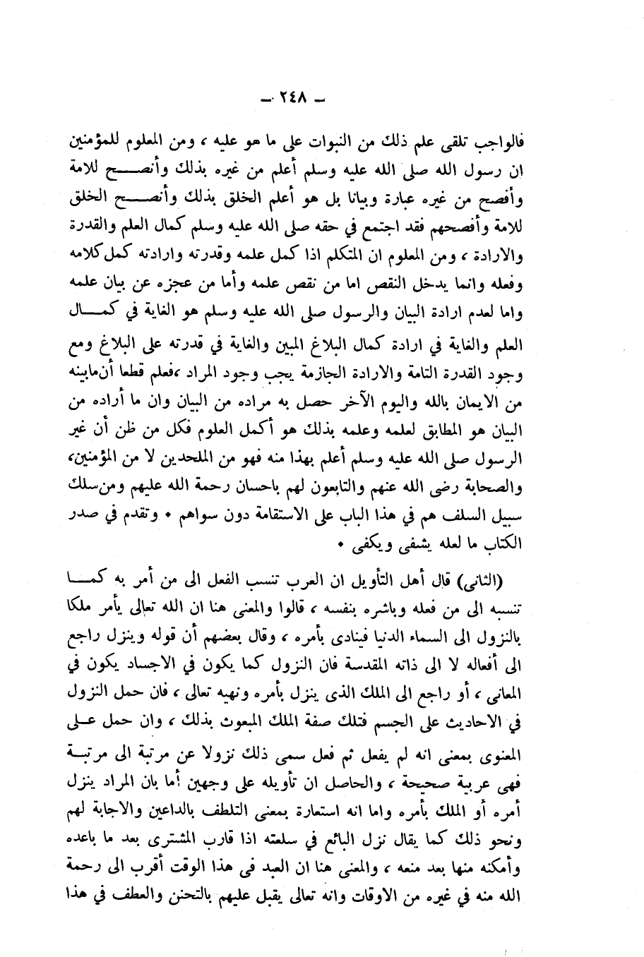 وَإِذَا كَانَ هَكَذَا فَالْوَاجِبُ تَلَقِّي عِلْمِ ذَلِكَ مِنَ النُّبُوَّاتِ عَلَى مَا هُوَ عَلَيْهِ، وَمِنَ الْمَعْلُومِ لِلْمُؤْمِنِينَ أَنَّ رَسُولَ اللَّهِ - صَلَّى اللَّهُ عَلَيْهِ وَسَلَّمَ - أَعْلَمُ مِنْ غَيْرِهِ بِذَلِكَ، وَأَنْصَحُ لِلْأُمَّةِ، وَأَفْصَحُ مِنْ غَيْرِهِ عِبَارَةً وَبَيَانًا، بَلْ هُوَ أَعْلَمُ الْخَلْقِ بِذَلِكَ، وَأَنْصَحُ الْخَلْقِ لِلْأُمَّةِ وَأَفْصَحِهِمْ، فَقَدِ اجْتَمَعَ فِي حَقِّهِ - صَلَّى اللَّهُ عَلَيْهِ وَسَلَّمَ - كَمَالُ الْعِلْمِ وَالْقُدْرَةِ وَالْإِرَادَةِ، مِنَ الْمَعْلُومِ أَنَّ الْمُتَكَلِّمَ إِذَا كَمُلَ عِلْمُهُ وَقُدْرَتُهُ وَإِرَادَتُهُ كَمُلَ كَلَامُهُ وَفِعْلُهُ، وَإِنَّمَا يَدْخُلُ النَّقْصُ إِمَّا مِنْ نَقْصِ عِلْمِهِ، وَإِمَّا مَنْ عَجْزِهِ عَنْ بَيَانِ عَلَمِهِ وَإِمَّا لِعَدَمِ إِرَادَةِ الْبَيَانِ وَالرَّسُولِ - صَلَّى اللَّهُ عَلَيْهِ وَسَلَّمَ - هُوَ الْغَايَةُ فِي كَمَالِ الْعِلْمِ وَالْغَايَةُ فِي إِرَادَةِ كَمَالِ الْبَلَاغِ الْمُبَيَّنِ وَالْغَايَةُ فِي قُدْرَتِهِ عَلَى الْبَلَاغِ، وَمَعَ وُجُودِ الْقُدْرَةِ التَّامَّةِ وَالْإِرَادَةِ الْجَازِمَةِ، يَجِبُ وُجُودُ الْمُرَادِ، فَعُلِمَ قَطْعًا أَنَّ مَا بَيَّنَهُ مِنَ الْإِيمَانِ بِاللَّهِ وَالْيَوْمِ الْآخِرِ حَصَلَ بِهِ مُرَادُهُ مِنَ الْبَيَانِ وَأَنَّ مَا أَرَادَهُ مِنَ الْبَيَانِ هُوَ الْمُطَابِقُ لِعِلْمِهِ، وَعِلْمُهُ بِذَلِكَ هُوَ أَكْمَلُ الْعُلُومِ، فَكُلُّ مَنْ ظَنَّ أَنَّ غَيْرَ الرَّسُولِ - صَلَّى اللَّهُ عَلَيْهِ وَسَلَّمَ - أَعْلَمُ بِهَذَا مِنْهُ فَهُوَ مِنَ الْمُلْحِدِينَ، لَا مِنَ الْمُؤْمِنِينَ، وَالصَّحَابَةُ - رَضِيَ اللَّهُ عَنْهُمْ - وَالتَّابِعُونَ لَهُمْ بِإِحْسَانٍ، - رَحْمَةُ اللَّهِ عَلَيْهِمْ - وَمَنْ سَلَكَ سَبِيلَ السَّلَفِ، هُمْ فِي هَذَا الْبَابِ عَلَى الِاسْتِقَامَةِ دُونَ سِوَاهُمْ. وَتَقَدَّمَ فِي صَدْرِ الْكِتَابِ مَا لَعَلَّهُ يَشْفِي وَيَكْفِي.