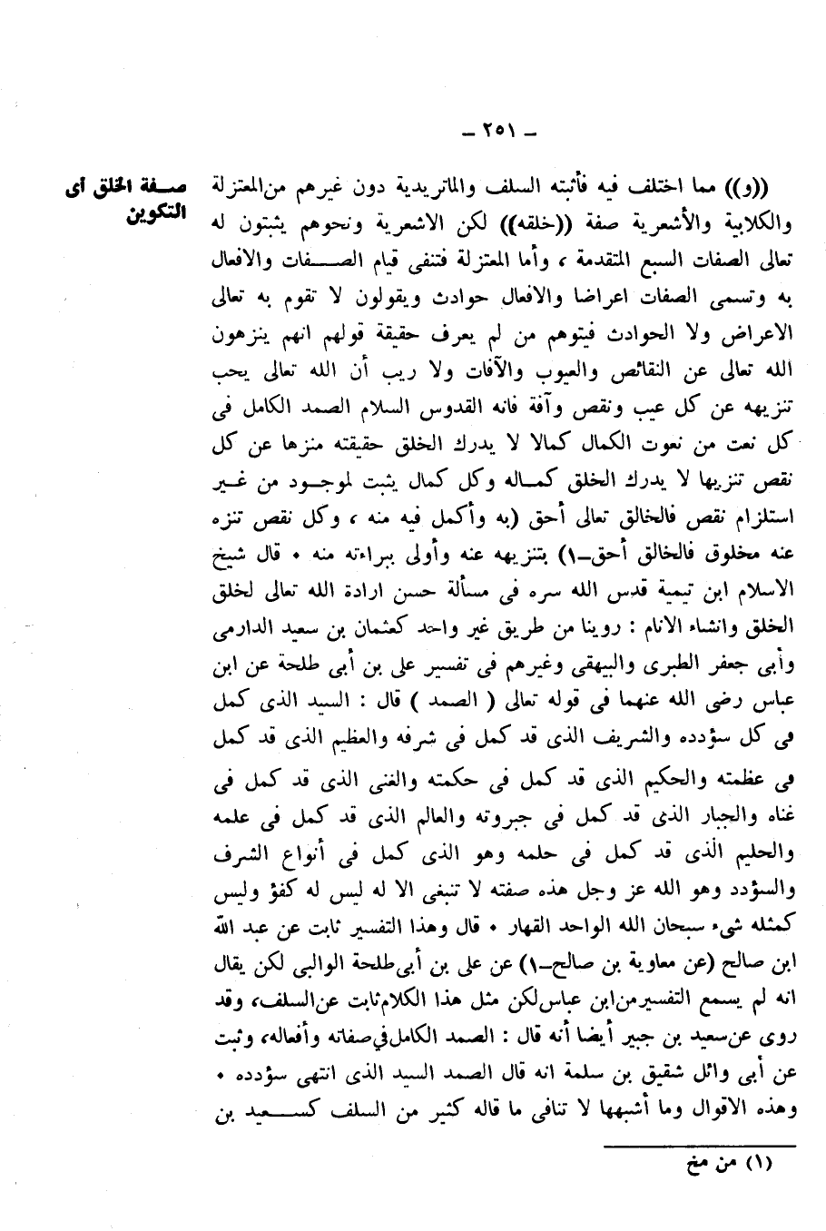 قَالَ شَيْخُ الْإِسْلَامِ ابْنُ تَيْمِيَّةَ - قَدَّسَ اللَّهُ سِرَّهُ - فِي مَسْأَلَةِ حُسْنِ إِرَادَةِ اللَّهِ تَعَالَى لِخَلْقِ الْخَلْقِ وَإِنْشَاءِ الْأَنَامِ: رُوِّينَا مِنْ طَرِيقِ غَيْرِ وَاحِدٍ كَعُثْمَانَ بْنِ سَعِيدٍ الدَّارِمِيِّ، وَأَبِي جَعْفَرٍ الطَّبَرِيِّ، وَالْبَيْهَقِيِّ، وَغَيْرِهِمْ فِي تَفْسِيرِ عَلِيِّ بْنِ طَلْحَةَ، عَنِ ابْنِ عَبَّاسٍ رَضِيَ اللَّهُ عَنْهُمَا فِي قَوْلِهِ تَعَالَى (الصَّمَدُ) قَالَ: السَّيِّدُ الَّذِي كَمُلَ فِي كُلِّ سُؤْدُدِهِ، وَالشَّرِيفُ الَّذِي قَدْ كَمُلَ فِي شَرَفِهِ، وَالْعَظِيمُ الَّذِي قَدْ كَمُلَ فِي عَظْمَتِهِ، وَالْحَكِيمُ الَّذِي قَدْ كَمُلَ فِي حِكْمَتِهِ، وَالْغَنِيُّ الَّذِي قَدْ كَمُلَ فِي غِنَاهُ، الْجَبَّارُ الَّذِي قَدْ كَمُلَ فِي جَبَرُوتِهِ، وَالْعَالِمُ الَّذِي قَدْ كَمُلَ فِي عِلْمِهِ، وَالْحَلِيمُ الَّذِي قَدْ كَمُلَ فِي حِلْمِهِ، وَهُوَ الَّذِي كَمُلَ فِي أَنْوَاعِ الشَّرَفِ وَالسُّؤْدُدِ، وَهُوَ اللَّهُ عَزَّ وَجَلَّ، هَذِهِ صِفَتُهُ لَا تَنْبَغِي إِلَّا لَهُ، لَيْسَ لَهُ كُفُؤٌ وَلَيْسَ كَمِثْلِهِ شَيْءٌ، سُبْحَانَ اللَّهِ الْوَاحِدِ الْقَهَّارِ.