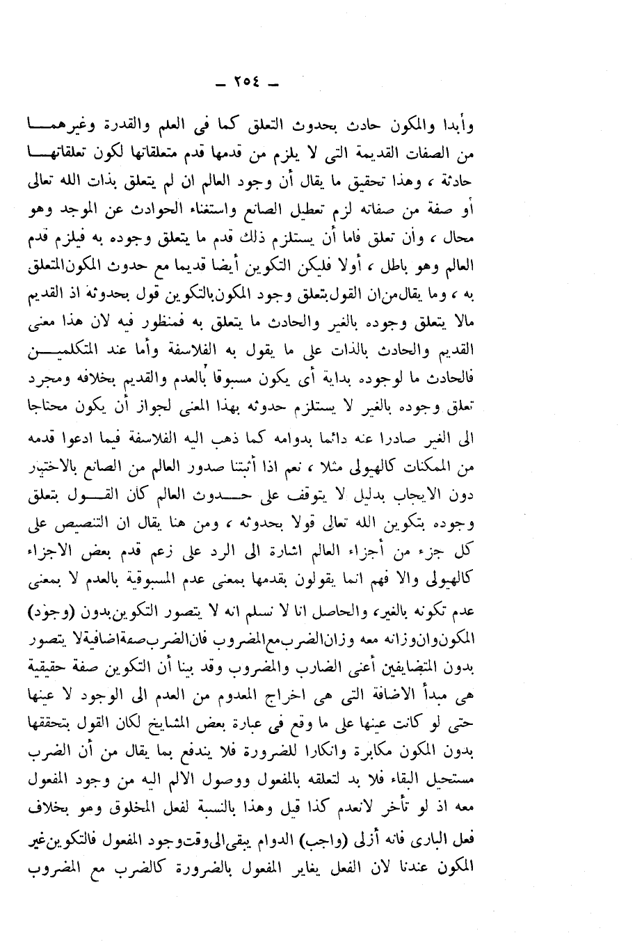 وَمِنْ هُنَا يُقَالُ إِنَّ التَّنْصِيصَ عَلَى كُلِّ جُزْءٍ مِنْ أَجْزَاءِ الْعَالَمِ إِشَارَةٌ إِلَى الرَّدِّ عَلَى زَعْمِ قِدَمِ بَعْضِ الْأَجْزَاءِ كَالْهَيُولَى، وَإِلَّا فَهُمْ إِنَّمَا يَقُولُونَ بِقِدَمِهَا بِمَعْنَى عَدَمِ الْمَسْبُوقِيَّةِ بِالْعَدَمِ لَا بِمَعْنَى عَدَمِ تَكَوُّنِهِ بِالْغَيْرِ، وَالْحَاصِلُ أَنَّا لَا نُسَلِّمُ أَنَّهُ لَا يُتَصَوَّرُ التَّكْوِينُ بِدُونِ (وُجُودِ) الْمُكَوَّنِ، وَأَنَّ وِزَانَهُ مَعَهُ وِزَانُ الضَّرْبِ مَعَ الْمَضْرُوبِ، فَإِنَّ الضَّرْبَ صِفَةٌ إِضَافِيَّةٌ لَا يُتَصَوَّرُ بِدُونِ الْمُتَضَايِفَيْنِ أَعْنِي الضَّارِبَ وَالْمَضْرُوبَ، وَقَدْ بَيَّنَّا أَنَّ التَّكْوِينَ صِفَةٌ حَقِيقِيَّةٌ هِيَ مَبْدَأُ الْإِضَافَةِ الَّتِي هِيَ إِخْرَاجُ الْمَعْدُومِ مِنَ الْعَدَمِ إِلَى الْوُجُودِ لَا عَيْنُهَا، حَتَّى لَوْ كَانَتْ عَيْنُهَا عَلَى مَا وَقَعَ فِي عِبَارَةٍ بَعْضِ الْمَشَايِخِ، لَكَانَ الْقَوْلُ بِتَحَقُّقِهَا بِدُونِ الْمُكَوَّنِ مُكَابَرَةً وَإِنْكَارًا لِلضَّرُورَةِ، فَلَا يَنْدَفِعُ بِمَا يُقَالُ مِنْ أَنَّ الضَّرْبَ مُسْتَحِيلُ الْبَقَاءِ، فَلَا بُدَّ لِتَعَلُّقِهِ بِالْمَفْعُولِ وَوُصُولِ الْأَلَمِ إِلَيْهِ مِنْ وُجُودِ الْمَفْعُولِ مَعَهُ، إِذْ لَوْ تَأَخَّرَ لَانْعَدَمَ كَذَا قِيلَ.