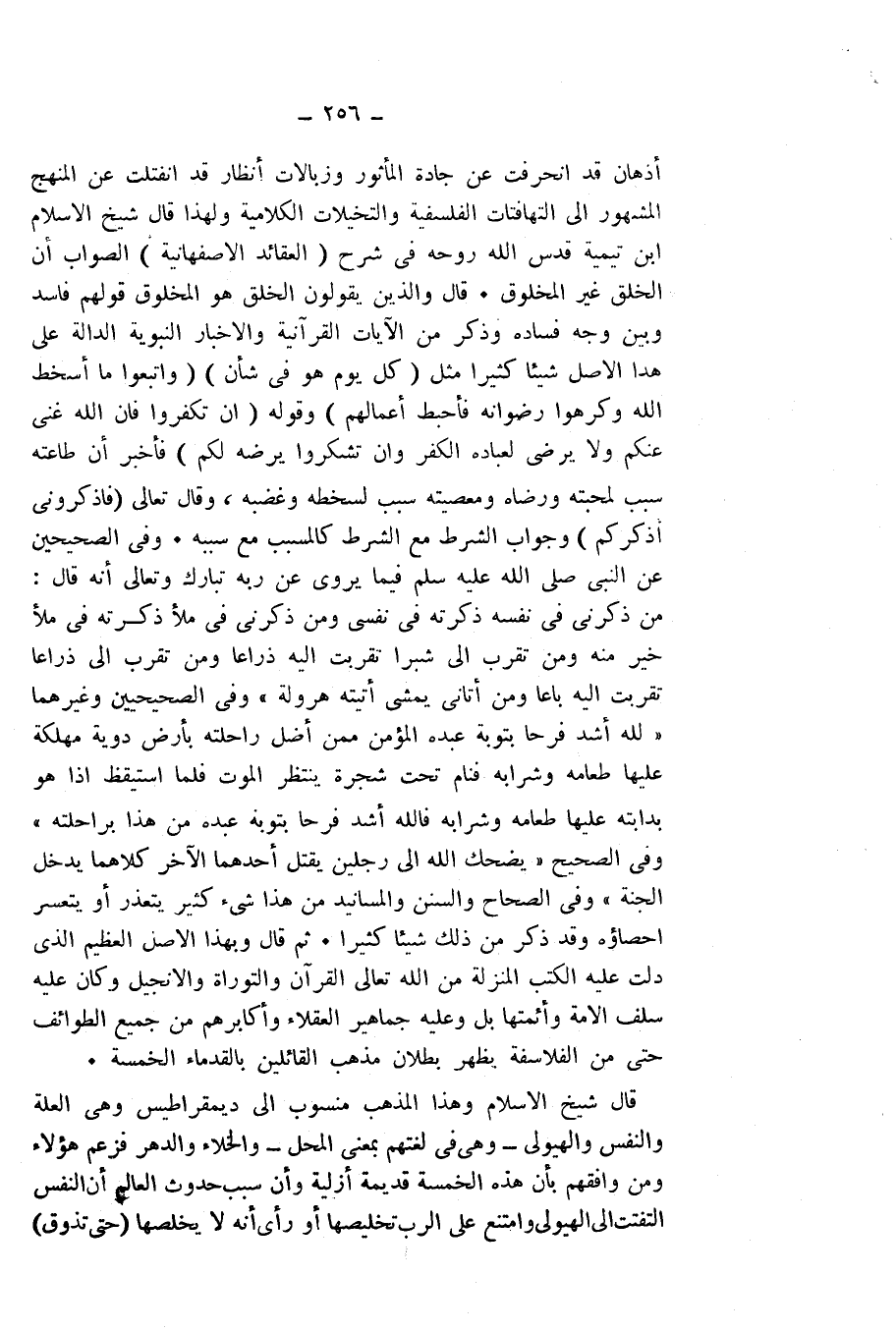 وَفِي الصَّحِيحِ " «يَضْحَكُ اللَّهُ إِلَى رَجُلَيْنِ يَقْتُلُ أَحَدُهُمَا الْآخَرَ كِلَاهُمَا يَدْخُلُ الْجَنَّةَ» "، وَفِي الصِّحَاحِ وَالسُّنَنِ وَالْمَسَانِيدِ مِنْ هَذَا شَيْءٌ كَثِيرٌ يَتَعَذَّرُ أَوْ يَتَعَسَّرُ إِحْصَاؤُهُ، وَقَدْ ذَكَرَ مِنْ ذَلِكَ شَيْئًا كَثِيرًا. ثُمَّ قَالَ: وَبِهَذَا الْأَصْلِ الْعَظِيمِ الَّذِي دَلَّتْ عَلَيْهِ الْكُتُبُ الْمُنَزَّلَةُ مِنَ اللَّهِ تَعَالَى، الْقُرْآنُ وَالتَّوْرَاةُ وَالْإِنْجِيلُ، وَكَانَ عَلَيْهِ سَلَفُ الْأُمَّةِ وَأَئِمَّتُهَا، بَلْ وَعَلَيْهِ جَمَاهِيرُ الْعُقَلَاءِ وَأَكَابِرُهُمْ مِنْ جَمِيعِ الطَّوَائِفِ حَتَّى مِنَ الْفَلَاسِفَةِ، يَظْهَرُ بُطْلَانُ مَذْهَبِ الْقَائِلِينَ بِالْقُدَمَاءِ الْخَمْسَةِ.
