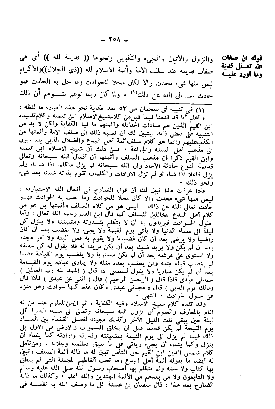 وَالنُّزُولِ وَالْإِتْيَانِ وَالْمَجِيءِ وَالتَّكْوِينِ وَنَحْوِهَا ((قَدِيمَةٌ لِلَّهِ)) أَيْ هِيَ صِفَاتٌ قَدِيمَةٌ عِنْدَ سَلَفِ الْأُمَّةِ وَأَئِمَّةِ الْإِسْلَامِ لِلَّهِ ((ذِي الْجَلَالِ)) وَالْإِكْرَامِ لَيْسَ مِنْهَا شَيْءٌ مُحْدَثٌ وَإِلَّا لَكَانَ مَحَلًّا لِلْحَوَادِثِ وَمَا حَلَّ بِهِ الْحَادِثُ فَهُوَ حَادِثٌ تَعَالَى اللَّهُ عَنْ ذَلِكَ. وَلَمَّا كَانَ رُبَّمَا تَوَهَّمَ مُتَوَهِّمٌ أَنَّ ذَلِكَ