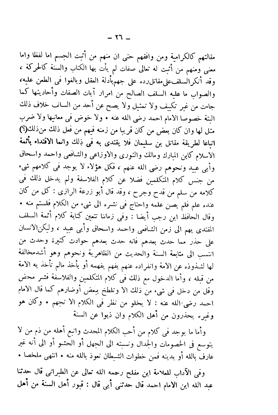 وَكَانَ هُوَ وَغَيْرُهُ يُحَذِّرُونَ مِنْ أَهْلِ الْكَلَامِ، وَإِنْ ذَبُّوا عَنِ السُّنَّةِ، وَأَمَّا مَا يُوجَدُ فِي كَلَامِ مَنْ أَحَبَّ الْكَلَامَ الْمُحْدَثَ، وَاتَّبَعَ أَهْلَهُ مِنْ ذَمِّ مَنْ لَا يَتَوَسَّعُ فِي الْخُصُومَاتِ وَالْجِدَالِ وَنِسْبَتِهِ إِلَى الْجَهْلِ أَوِ الْحَشْوِ، أَوْ إِلَى أَنَّهُ غَيْرُ عَارِفٍ بِاللَّهِ أَوْ بِدِينِهِ، فَمِنْ خُطُوَاتِ الشَّيْطَانِ، نَعُوذُ بِاللَّهِ مِنْهُ. انْتَهَى مُلَخَّصًا.