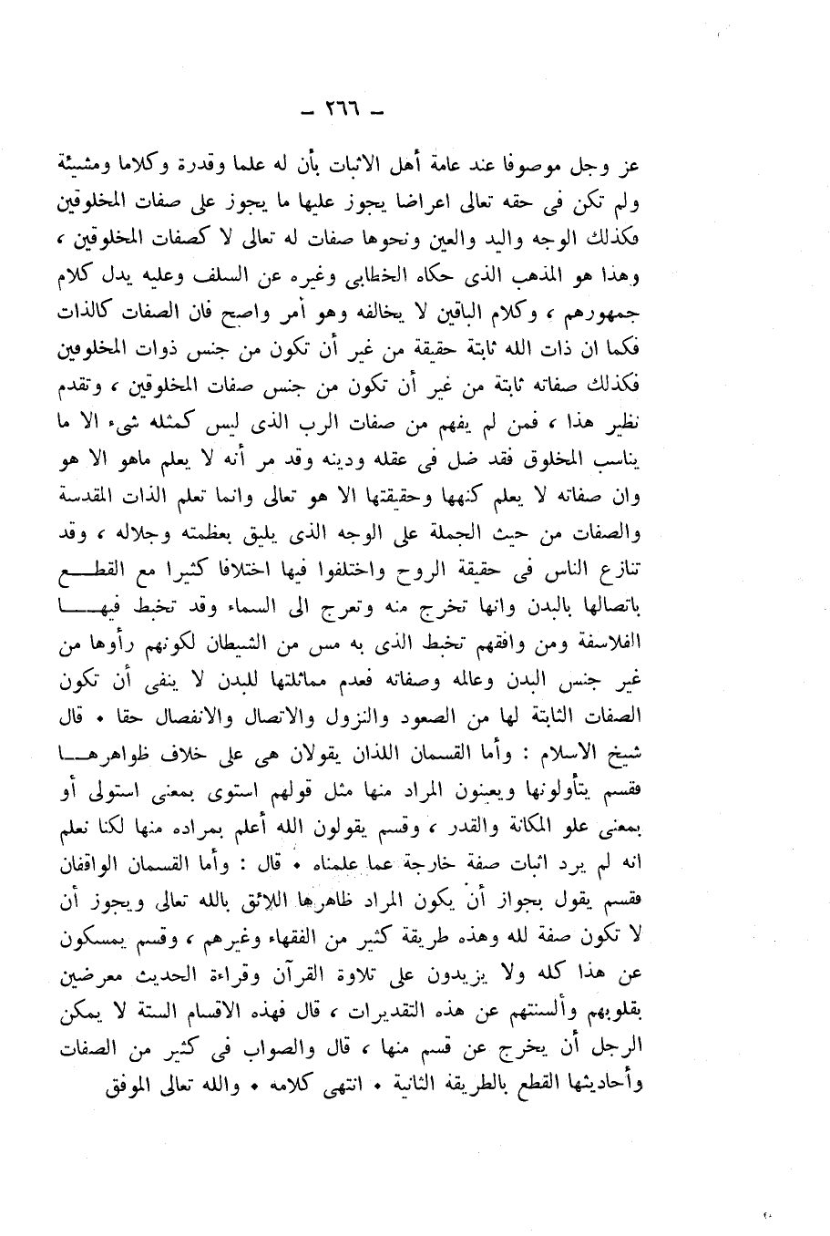 عَزَّ وَجَلَّ مَوْصُوفًا عِنْدَ عَامَّةِ أَهْلِ الْإِثْبَاتِ بِأَنَّ لَهُ عِلْمًا وَقُدْرَةً وَكَلَامًا وَمَشِيئَةً، وَلَمْ تَكُنْ فِي حَقِّهِ تَعَالَى أَعْرَاضًا يَجُوزُ عَلَيْهَا مَا يَجُوزُ عَلَى صِفَاتِ الْمَخْلُوقِينَ، فَكَذَلِكَ الْوَجْهُ وَالْيَدُ وَالْعَيْنُ وَنَحْوُهَا صِفَاتٌ لَهُ تَعَالَى لَا كَصِفَاتِ الْمَخْلُوقِينَ، وَهَذَا هُوَ الْمَذْهَبُ الَّذِي حَكَاهُ الْخَطَّابِيُّ وَغَيْرُهُ عَنِ السَّلَفِ، وَعَلَيْهِ يَدُلُّ كَلَامُ جُمْهُورِهِمْ، وَكَلَامُ الْبَاقِينَ لَا يُخَالِفُهُ، وَهُوَ أَمْرٌ وَاضِحٌ، فَإِنَّ الصِّفَاتَ كَالذَّاتِ فَكَمَا أَنَّ ذَاتَ اللَّهِ ثَابِتَةٌ حَقِيقَةً مِنْ غَيْرِ أَنْ تَكُونَ مِنْ جِنْسِ ذَوَاتِ الْمَخْلُوقِينَ، فَكَذَلِكَ صِفَاتُهُ ثَابِتَةٌ مِنْ غَيْرِ أَنْ تَكُونَ مِنْ جِنْسِ صِفَاتِ الْمَخْلُوقِينَ، وَتَقَدَّمَ نَظِيرُ هَذَا، فَمَنْ لَمْ يَفْهَمْ مِنْ صِفَاتِ الرَّبِّ الَّذِي لَيْسَ كَمِثْلِهِ شَيْءٌ إِلَّا مَا يُنَاسِبُ الْمَخْلُوقَ، فَقَدْ ضَلَّ فِي عَقْلِهِ وَدِينِهِ، وَقَدْ مَرَّ أَنَّهُ لَا يَعْلَمُ مَا هُوَ إِلَّا هُوَ، وَأَنَّ صِفَاتَهُ لَا يَعْلَمُ كُنْهَهَا وَحَقِيقَتَهَا إِلَّا هُوَ تَعَالَى.