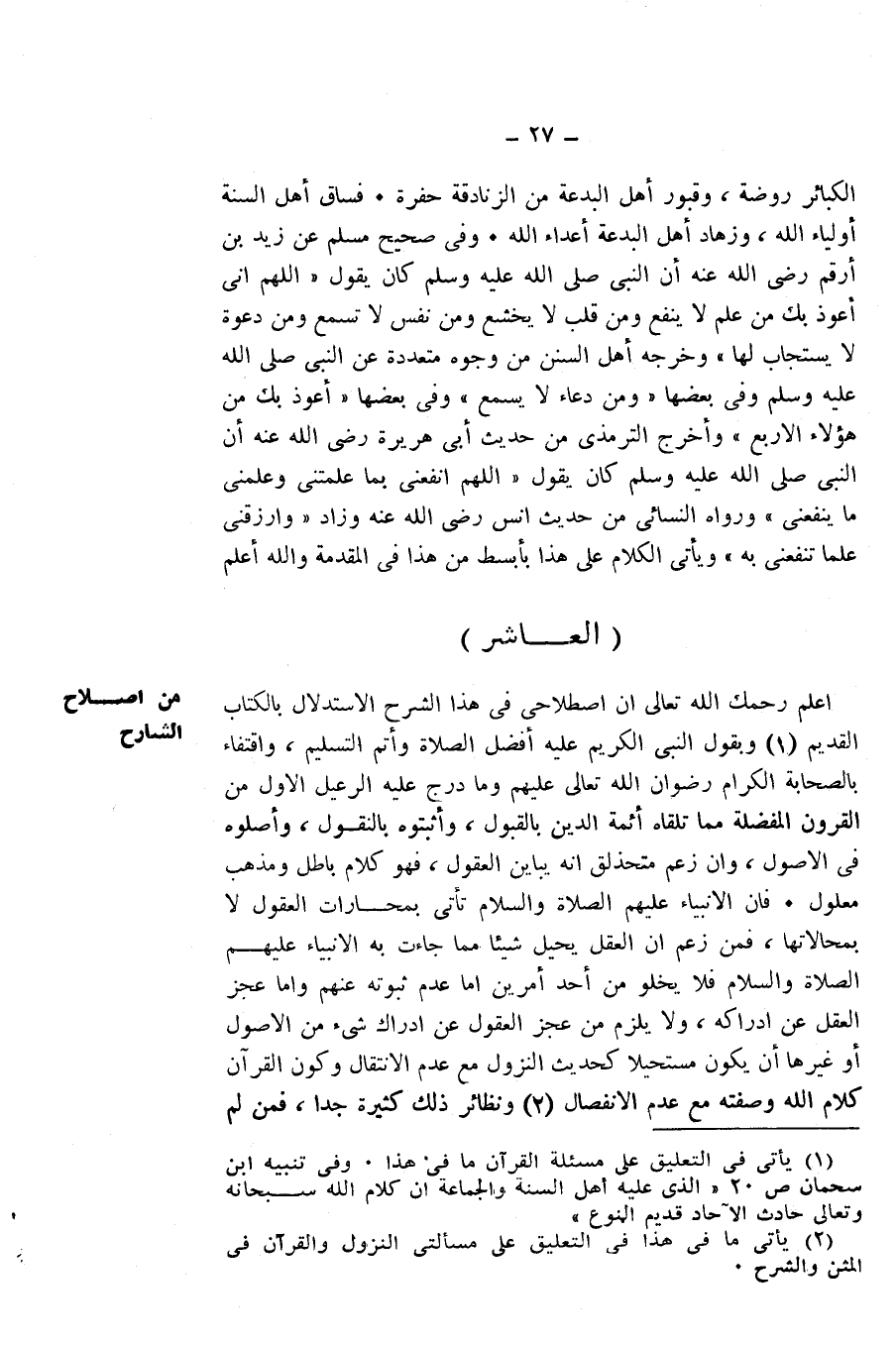 اعْلَمْ رَحِمَكَ اللَّهُ - تَعَالَى - أَنَّ اصْطِلَاحِي فِي هَذَا الشَّرْحِ الِاسْتِدْلَالُ بِالْكِتَابِ وَبِقَوْلِ النَّبِيِّ الْكَرِيمِ - عَلَيْهِ أَفْضَلُ الصَّلَاةِ وَأَتَمُّ التَّسْلِيمِ، وَاقْتِفَاءٌ بِالصَّحَابَةِ الْكِرَامِ - رِضْوَانُ اللَّهِ تَعَالَى عَلَيْهِمْ، وَمَا دَرَجَ عَلَيْهِ الرَّعِيلُ الْأَوَّلُ مِنَ الْقُرُونِ الْمُفَضَّلَةِ، مِمَّا تَلَقَّاهُ أَئِمَّةُ الدِّينِ بِالْقَبُولِ، وَأَثْبَتُوهُ بِالنُّقُولِ، وَأَصَّلُوهُ فِي الْأُصُولِ، وَإِنْ زَعَمَ مُتَحَذْلِقٌ أَنَّهُ يُبَايِنُ الْعُقُولَ فَهُوَ كَلَامٌ بَاطِلٌ، وَمَذْهَبٌ مَعْلُولٌ. فَإِنَّ الْأَنْبِيَاءَ - عَلَيْهِمُ الصَّلَاةُ وَالسَّلَامُ، تَأْتِي بِمُحَارَاتِ الْعُقُولِ لَا بِمُحَالَاتِهَا، فَمَنْ زَعَمَ أَنَّ الْعَقْلَ يُحِيلُ شَيْئًا مِمَّا جَاءَتْ بِهِ الْأَنْبِيَاءُ - عَلَيْهِمُ الصَّلَاةُ وَالسَّلَامُ - فَلَا يَخْلُو مِنْ أَحَدِ أَمْرَيْنِ: إِمَّا عَدَمُ ثُبُوتِهِ عَنْهُمْ، وَإِمَّا عَجْزُ الْعَقْلِ عَنْ إِدْرَاكِهِ، وَلَا يَلْزَمُ مِنْ عَجْزِ الْعُقُولِ عَنْ إِدْرَاكِ شَيْءٍ مِنَ الْأُصُولِ أَوْ غَيْرِهَا أَنْ يَكُونَ مُسْتَحِيلًا، كَحَدِيثِ النُّزُولِ مَعَ عَدَمِ الِانْتِقَالِ، وَكَوْنِ الْقُرْآنِ كَلَامَ اللَّهِ وَصِفَتَهُ مَعَ عَدَمِ الِانْفِصَالِ، وَنَظَائِرُ ذَلِكَ كَثِيرَةٌ جِدًّا، فَمَنْ لَمْ