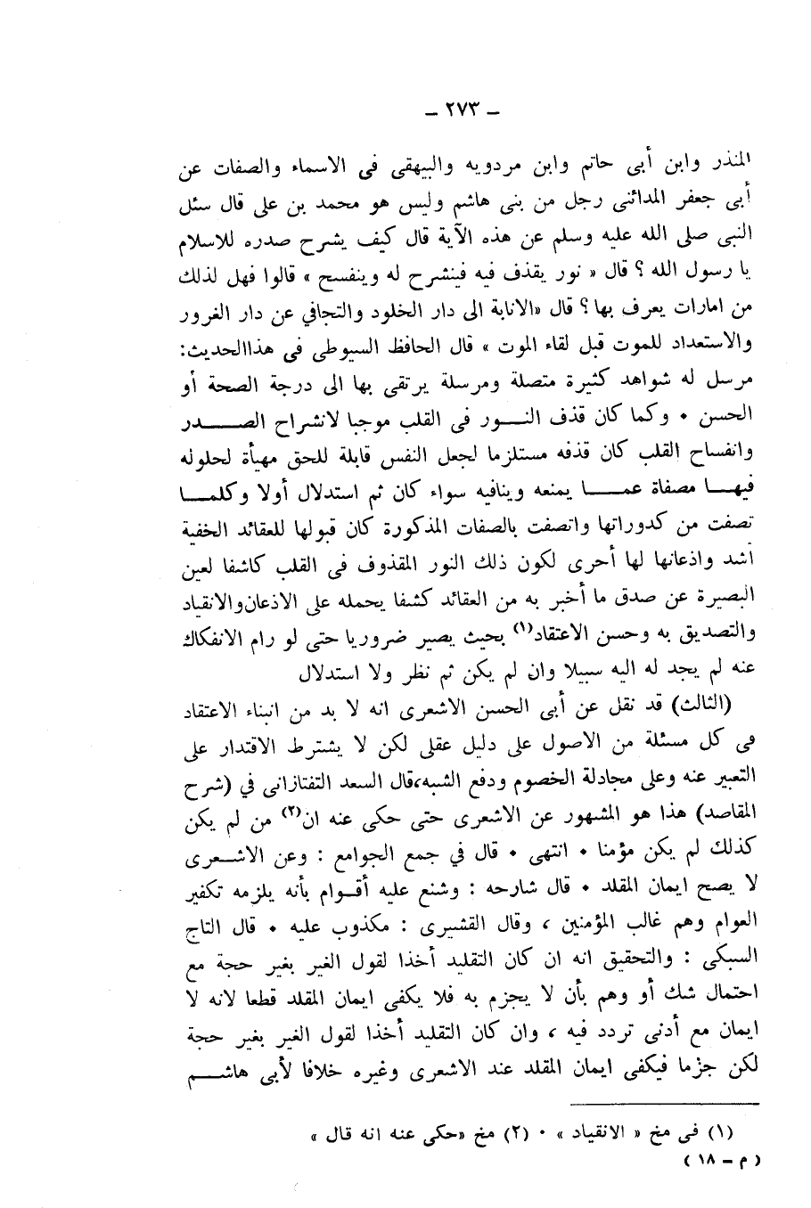 (الثَّالِثُ) قَدْ نُقِلَ عَنْ أَبِي الْحَسَنِ الْأَشْعَرِيِّ أَنَّهُ لَا بُدَّ مِنَ انْبِنَاءِ الِاعْتِقَادِ فِي كُلِّ مَسْأَلَةٍ مِنَ الْأُصُولِ عَلَى دَلِيلٍ عَقْلِيٍّ، لَكِنْ يُشْتَرَطُ الِاقْتِدَارُ عَلَى التَّعْبِيرِ عَنْهُ، وَعَلَى مُجَادَلَةِ الْخُصُومِ، وَدَفْعِ الشُّبَهِ، قَالَ السَّعْدُ التَّفْتَازَانِيُّ فِي (شَرْحِ الْمَقَاصِدِ) : هَذَا هُوَ الْمَشْهُورُ عَنِ الْأَشْعَرِيِّ حَتَّى حُكِيَ عَنْهُ أَنَّ مَنْ لَمْ يَكُنْ كَذَلِكَ لَمْ يَكُنْ مُؤْمِنًا. انْتَهَى.