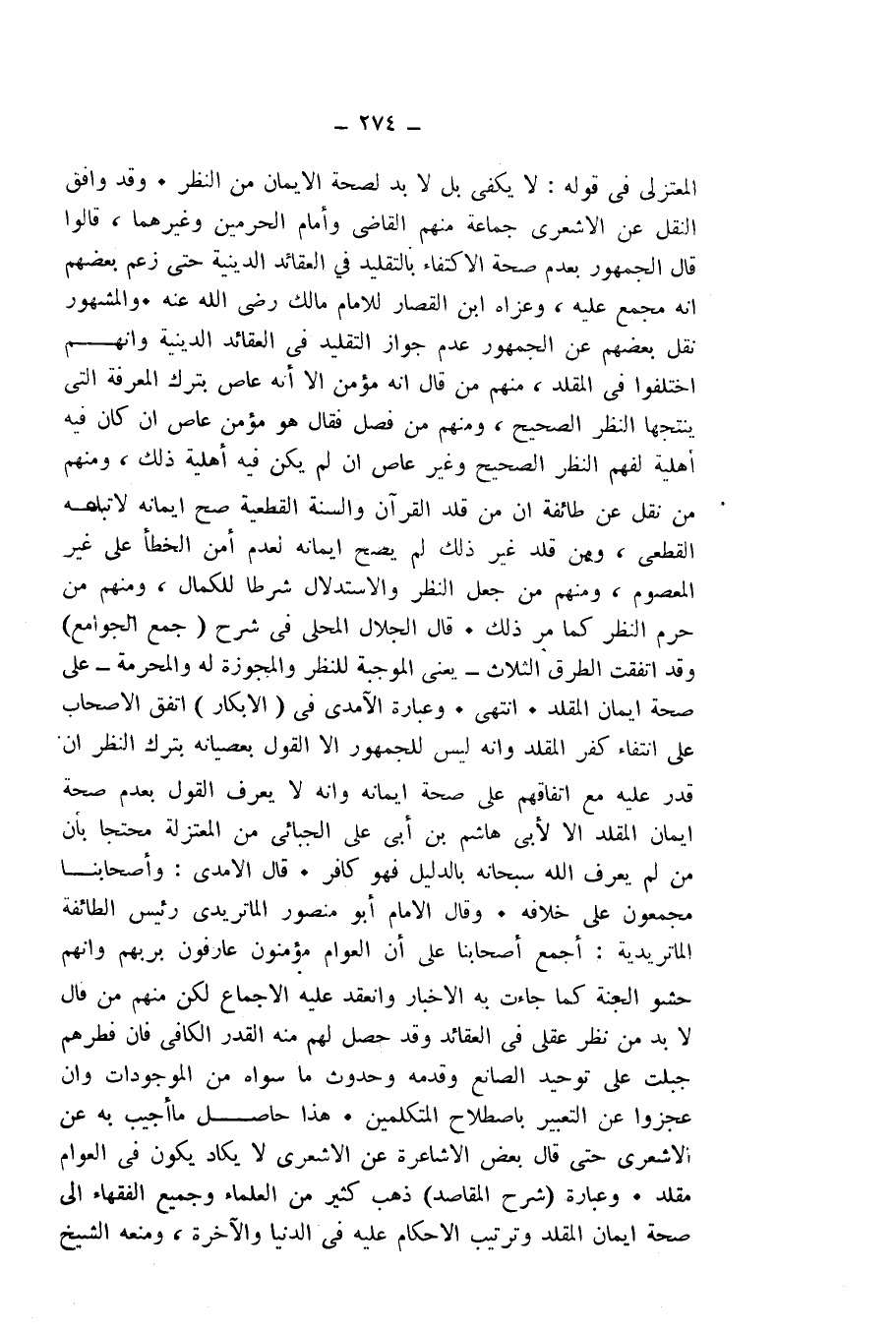 وَعِبَارَةُ الْآمِدِيِّ فِي (الْأَبْكَارِ) اتَّفَقَ الْأَصْحَابُ عَلَى انْتِفَاءِ كُفْرِ الْمُقَلِّدِ، وَأَنَّهُ لَيْسَ لِلْجُمْهُورِ إِلَّا الْقَوْلُ بِعِصْيَانِهِ بِتَرْكِ النَّظَرِ إِنْ قَدَرَ عَلَيْهِ مَعَ اتِّفَاقِهِمْ عَلَى صِحَّةِ إِيمَانِهِ وَأَنَّهُ لَا يُعْرَفُ الْقَوْلُ بِعَدَمِ صِحَّةِ إِيمَانِ الْمُقَلِّدِ إِلَّا لِأَبِي هَاشِمِ بْنِ أَبِي عَلِيٍّ الْجُبَّائِيِّ مِنَ الْمُعْتَزِلَةِ مُحْتَجًّا بِأَنَّ مَنْ لَمْ يَعْرِفِ اللَّهَ سُبْحَانَهُ وَتَعَالَى بِالدَّلِيلِ فَهُوَ كَافِرٌ. قَالَ الْآمِدِيُّ: وَأَصْحَابُنَا مُجْمِعُونَ عَلَى خِلَافِهِ.