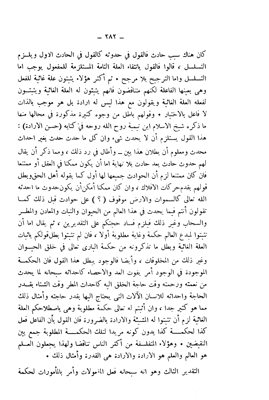 قَالُوا: فَالْقَوْلُ بِانْتِفَاءِ الْعِلَّةِ التَّامَّةِ الْمُسْتَلْزِمَةِ لِلْمَفْعُولِ يُوجِبُ إِمَّا التَّسَلْسُلَ وَإِمَّا التَّرْجِيحَ بِلَا مُرَحِّجٍ، ثُمَّ أَكْثَرُ هَؤُلَاءِ يُثْبِتُونَ عِلَّةً غَائِيَّةً لِلْفِعْلِ، وَهِيَ بِعَيْنِهَا الْفَاعِلَةُ، لَكِنَّهُمْ مُتَنَاقِضُونَ، فَإِنَّهُمْ يُثْبِتُونَ لَهُ الْعِلَّةَ الْغَائِيَّةَ، وَيُثْبِتُونَ لِفِعْلِهِ الْعِلَّةَ الْغَائِيَّةَ، وَيَقُولُونَ مَعَ هَذَا: لَيْسَ لَهُ إِرَادَةٌ، بَلْ هُوَ مُوجِبٌ بِالذَّاتِ، لَا فَاعِلٌ بِالِاخْتِيَارِ. وَقَوْلُهُمْ بَاطِلٌ مِنْ وُجُوهٍ كَثِيرَةٍ مَذْكُورَةٍ فِي مَحَالِّهَا، مِنْهَا مَا ذَكَرَهُ شَيْخُ الْإِسْلَامِ ابْنُ تَيْمِيَّةَ - رَوَّحَ اللَّهُ رُوحَهُ - فِي كِتَابِهِ (حُسْنِ الْإِرَادَةِ) : هَذَا الْقَوْلُ يَسْتَلْزِمُ أَنْ لَا يَحْدُثَ شَيْءٌ وَأَنَّ كُلَّ مَا حَدَثَ حَدَثَ بِغَيْرِ إِحْدَاثِ مُحْدِثٍ، وَمَعْلُومٌ أَنَّ بُطْلَانَ هَذَا بَيِّنٌ - وَأَطَالَ فِي رَدِّ ذَلِكَ، وَمِمَّا ذَكَرَ: أَنْ يُقَالَ لَهُمْ: حُدُوثُ حَادِثٍ بَعْدَ حَادِثٍ بِلَا نِهَايَةٍ، إِمَّا أَنْ يَكُونَ مُمْكِنًا فِي الْعَقْلِ، أَوْ مُمْتَنِعًا، فَإِنْ كَانَ مُمْتَنِعًا لَزِمَ أَنَّ الْحَوَادِثَ جَمِيعَهَا لَهَا أَوَّلٌ كَمَا يَقُولُهُ أَهْلُ الْحَقِّ، وَبَطَلَ قَوْلُهُمْ بِقِدَمِ حَرَكَاتِ الْأَفْلَاكِ، وَإِنْ كَانَ مُمْكِنًا أَمْكَنَ أَنْ يَكُونَ حُدُوثُ مَا أَحْدَثَهُ اللَّهُ - تَعَالَى - كَالسَّمَاوَاتِ، وَالْأَرْضِ مَوْقُوفٌ عَلَى حَوَادِثَ قَبْلَ ذَلِكَ كَمَا تَقُولُونَ أَنْتُمْ فِيمَا يَحْدُثَ فِي هَذَا الْعَالَمِ مِنَ الْحَيَوَانِ، وَالنَّبَاتِ، وَالْمَعَادِنِ، وَالْمَطَرِ، وَالسَّحَابِ، وَغَيْرِ ذَلِكَ، فَيَلْزَمُ فَسَادُ حُجَّتِكُمْ عَلَى التَّقْدِيرَيْنِ، ثُمَّ يُقَالُ إِمَّا أَنْ تُثْبِتُوا لِمُبْدِعِ الْعَالَمِ حِكْمَةً وَغَايَةً مَطْلُوبَةً، أَوْ لَا، فَإِنْ لَمْ تُثْبِتُوا بَطَلَ قَوْلُكُمْ بِإِثْبَاتِ الْعِلَّةِ الْغَائِيَّةِ وَبَطَلَ مَا تَذْكُرُونَهُ مِنْ حِكْمَةِ الْبَارِي تَعَالَى فِي خَلْقِ الْحَيَوَانِ وَغَيْرِ ذَلِكَ مِنَ الْمَخْلُوقَاتِ، وَأَيْضًا فَالْوُجُودُ يُبْطِلُ هَذَا الْقَوْلَ، فَإِنَّ الْحِكْمَةَ الْمَوْجُودَةَ فِي الْوُجُودِ أَمْرٌ يَفُوتُ الْعَدَّ وَالْإِحْصَاءَ، كَإِحْدَاثِهِ سُبْحَانَهُ لِمَا يَحْدُثُ مِنْ نِعْمَتِهِ وَرَحْمَتِهِ وَقْتَ حَاجَةِ الْخَلْقِ إِلَيْهِ كَإِحْدَاثِ الْمَطَرِ وَقْتَ الشِّتَاءِ بِقَدْرِ الْحَاجَةِ وَإِحْدَاثِهِ لِلْإِنْسَانِ الْآلَاتِ الَّتِي يَحْتَاجُ إِلَيْهَا بِقَدْرِ حَاجَتِهِ. وَأَمْثَالُ ذَلِكَ مِمَّا هُوَ - كَثِيرٌ جِدًّا. وَإِنْ أَثْبَتُّمْ لَهُ تَعَالَى حِكْمَةً مَطْلُوبَةً وَهِيَ بِاصْطِلَاحِكُمُ الْعِلَّةَ الْغَائِيَّةَ لَزِمَ أَنْ تُثْبِتُوا لَهُ الْمَشِيئَةَ، وَالْإِرَادَةَ بِالضَّرُورَةِ، فَإِنَّ الْقَوْلَ بِأَنَّ الْفَاعِلَ فَعَلَ كَذَا لِحِكْمَةِ كَذَا بِدُونِ كَوْنِهِ مُرِيدًا لِتِلْكَ الْحِكْمَةِ الْمَطْلُوبَةِ جَمْعٌ بَيْنَ النَّقِيضَيْنِ. وَهَؤُلَاءِ الْمُتَفَلْسِفَةُ مِنْ أَكْثَرِ النَّاسِ تَنَاقُضًا، وَلِهَذَا يَجْعَلُونَ الْعِلْمَ هُوَ الْعَالَمُ، وَالْعِلْمَ هُوَ الْإِرَادَةُ، وَالْإِرَادَةَ هِيَ الْقُدْرَةُ، وَأَمْثَالَ ذَلِكَ. وَالتَّقْدِيرُ الثَّالِثُ: وَهُوَ أَنَّهُ سُبْحَانَهُ فَعَلَ الْمَفْعُولَاتِ، وَأَمَرَ بِالْمَأْمُورَاتِ لِحِكْمَةٍ