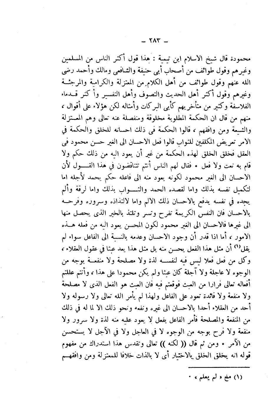 قَالَ شَيْخُ الْإِسْلَامِ ابْنُ تَيْمِيَّةَ: هَذَا قَوْلُ أَكْثَرِ النَّاسِ مِنَ الْمُسْلِمِينَ وَغَيْرِهِمْ، وَقَوْلُ طَوَائِفَ مِنْ أَصْحَابِ أَبِي حَنِيفَةَ، وَالشَّافِعِيِّ وَمَالِكٍ وَأَحْمَدَ - رَضِيَ اللَّهُ عَنْهُمْ، وَقَوْلُ طَوَائِفَ مِنْ أَهْلِ الْكَلَامِ مِنَ الْمُعْتَزِلَةِ، وَالْكَرَّامِيَّةِ، وَالْمُرْجِئَةِ وَغَيْرِهِمْ، وَقَوْلُ أَكْثَرِ أَهْلِ الْحَدِيثِ، وَالتَّصَوُّفِ وَأَهْلِ التَّفْسِيرِ وَأَكْثَرِ قُدَمَاءِ الْفَلَاسِفَةِ وَكَثِيرٍ مِنْ مُتَأَخِّرِيهِمْ كَأَبِي الْبَرَكَاتِ وَأَمْثَالِهِ لَكِنَّ هَؤُلَاءِ عَلَى أَقْوَالٍ، مِنْهُمْ مَنْ قَالَ إِنَّ الْحِكْمَةَ الْمَطْلُوبَةَ مَخْلُوقَةٌ وَمُنْفَصِلَةٌ عَنْهُ تَعَالَى، وَهُمُ الْمُعْتَزِلَةُ، وَالشِّيعَةُ وَمَنْ وَافَقَهُمْ، قَالُوا: الْحِكْمَةُ فِي ذَلِكَ إِحْسَانُهُ لِلْخَلْقِ، وَالْحِكْمَةُ فِي الْأَمْرِ تَعْرِيضُ الْمُكَلَّفِينَ لِلثَّوَابِ، قَالُوا: فِعْلُ الْإِحْسَانِ إِلَى الْغَيْرِ حَسَنٌ مَحْمُودٌ فِي الْعَقْلِ، فَخَلَقَ الْخَلْقَ لِهَذِهِ الْحِكْمَةِ مِنْ غَيْرِ أَنْ يَعُودَ إِلَيْهِ مِنْ ذَلِكَ حُكْمٌ وَلَا قَامَ بِهِ نَعْتٌ وَلَا فِعْلٌ، فَقَالَ لَهُمُ النَّاسُ: أَنْتُمْ تَتَنَاقَضُونَ فِي هَذَا الْقَوْلِ ; لِأَنَّ الْإِحْسَانَ إِلَى الْغَيْرِ مَحْمُودٌ لِكَوْنِهِ يَعُودُ مِنْهُ إِلَى فَاعِلِهِ حُكْمٌ يُحْمَدُ لِأَجْلِهِ، إِمَّا لِتَكْمِيلِ نَفْسِهِ بِذَلِكَ، وَإِمَّا لِقَصْدِهِ الْحَمْدَ وَالثَّوَابَ بِذَلِكَ، وَإِمَّا لِرِقَّةٍ وَأَلَمٍ يَجِدُهُ فِي نَفْسِهِ، يَدْفَعُ بِالْإِحْسَانِ ذَلِكَ الْأَلَمَ، وَإِمَّا لِالْتِذَاذِهِ وَسُرُورِهِ وَفَرَحِهِ بِالْإِحْسَانِ، فَإِنَّ النَّفْسَ الْكَرِيمَةَ تَفْرَحُ وَتُسَرُّ وَتَلْتَذُّ بِالْخَيْرِ الَّذِي يَحْصُلُ مِنْهَا إِلَى غَيْرِهَا، فَالْإِحْسَانُ إِلَى الْغَيْرِ مَحْمُودٌ لِكَوْنِ الْمُحْسِنِ يَعُودُ إِلَيْهِ مِنْ فِعْلِهِ هَذِهِ الْأُمُورُ. أَمَّا إِذَا قَدَّرَ أَنَّ وُجُودَ الْإِحْسَانِ وَعَدَمَهُ بِالنِّسْبَةِ إِلَى الْفَاعِلِ سَوَاءٌ؛ لَمْ يَقُلْ: إِنَّ مِثْلَ هَذَا الْفِعْلِ يَحْسُنُ مِنْهُ، بَلْ مِثْلُ هَذَا يُعَدُّ عَبَثًا فِي عُقُولِ الْعُقَلَاءِ، وَكُلُّ مَنْ فَعَلَ فِعْلًا لَيْسَ فِيهِ لِنَفْسِهِ لَذَّةٌ وَلَا مَصْلَحَةٌ وَلَا مَنْفَعَةٌ بِوَجْهٍ مِنَ الْوُجُوهِ لَا عَاجِلَةٌ وَلَا آجِلَةٌ، كَانَ عَبَثًا، وَلَمْ يَكُنْ مَحْمُودًا عَلَى هَذَا، وَأَنْتُمْ عَلَّلْتُمْ أَفْعَالَهُ تَعَالَى فِرَارًا مِنَ الْعَبَثِ فَوَقَعْتُمْ فِيهِ، فَإِنَّ الْعَبَثَ هُوَ الْفِعْلُ الَّذِي لَا مَصْلَحَةَ وَلَا مَنْفَعَةَ وَلَا فَائِدَةَ تَعُودُ عَلَى الْفَاعِلِ ; وَلِهَذَا لَمْ يَأْمُرِ اللَّهُ - تَعَالَى - وَلَا رَسُولُهُ وَلَا أَحَدٌ مِنَ الْعُقَلَاءِ أَحَدًا بِالْإِحْسَانِ إِلَى غَيْرِهِ وَنَفْعِهِ وَنَحْوِ ذَلِكَ إِلَّا لِمَا لَهُ فِي ذَلِكَ مِنَ الْمَنْفَعَةِ، وَالْمَصْلَحَةِ، فَأَمْرُ الْفَاعِلِ بِفِعْلٍ لَا يَعُودُ عَلَيْهِ مِنْهُ لَذَّةٌ وَلَا سُرُورٌ وَلَا مَنْفَعَةٌ وَلَا فَرَحٌ بِوَجْهٍ مِنَ الْوُجُوهِ لَا فِي الْعَاجِلِ وَلَا فِي الْآجِلِ - لَا يُسْتَحْسَنُ مِنَ الْآمِرِ. وَمِنْ ثَمَّ قَالَ ((لَكِنَّهُ)) تَعَالَى وَتَقَدَّسَ. هَذَا اسْتِدْرَاكٌ مِنْ مَفْهُومِ قَوْلِهِ إِنَّهُ يَخْلُقُ الْخَلْقَ بِالِاخْتِيَارِ، أَيْ لَا بِالذَّاتِ خِلَافًا لِلْمُعْتَزِلَةِ وَمَنْ وَافَقَهُمْ