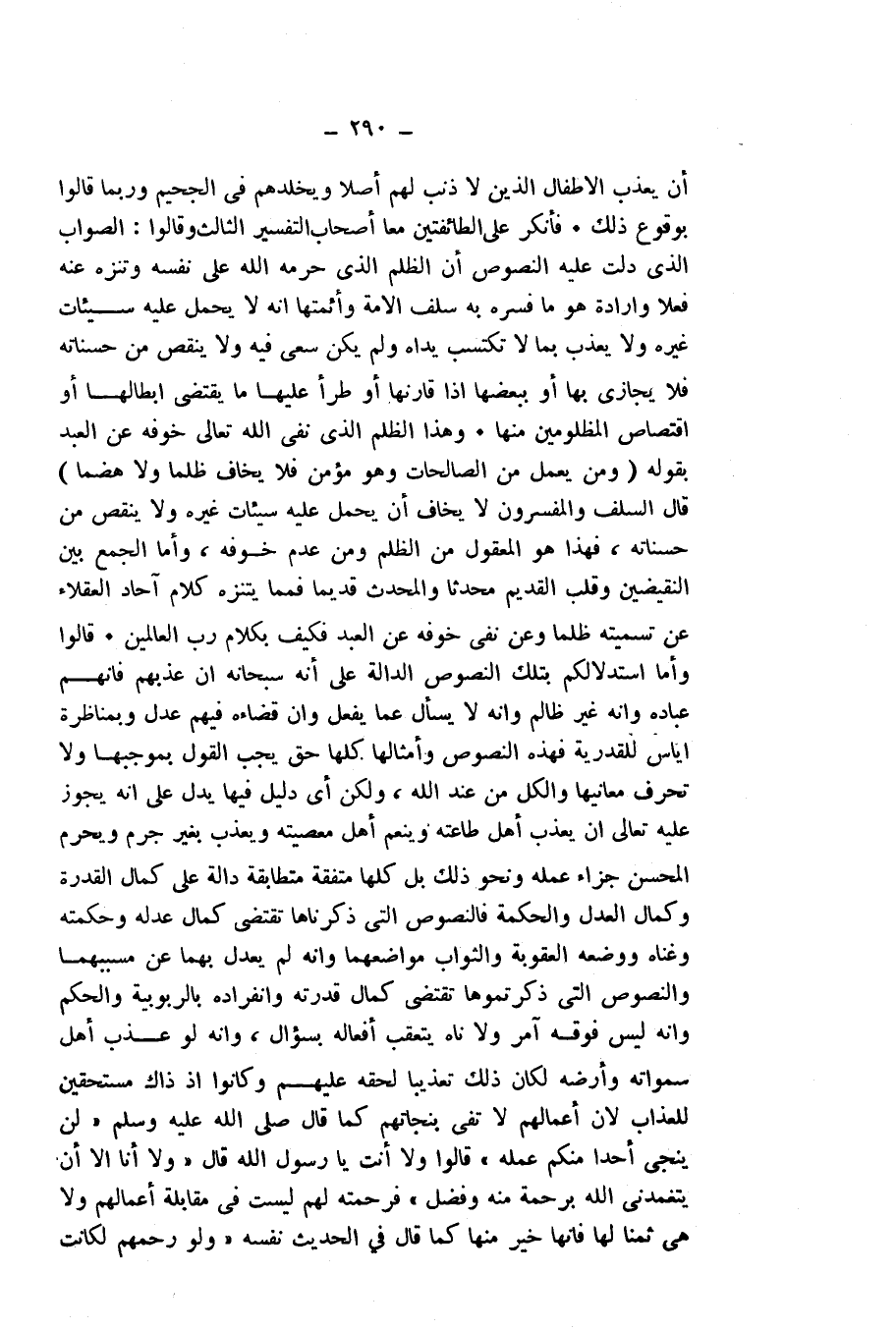 أَنْ يُعَذِّبَ الْأَطْفَالَ الَّذِينَ لَا ذَنْبَ لَهُمْ أَصْلًا، وَيُخَلِّدَهُمْ فِي الْجَحِيمِ، وَرُبَّمَا قَالُوا بِوُقُوعِ ذَلِكَ. فَأَنْكَرَ عَلَى الطَّائِفَتَيْنِ مَعًا أَصْحَابُ التَّفْسِيرِ الثَّالِثِ، وَقَالُوا: الصَّوَابُ الَّذِي دَلَّتْ عَلَيْهِ النُّصُوصُ أَنَّ الظُّلْمَ الَّذِي حَرَّمَهُ اللَّهُ عَلَى نَفْسِهِ، وَتَنَزَّهَ عَنْهُ فِعْلًا وَإِرَادَةً، هُوَ مَا فَسَّرَهُ بِهِ سَلَفُ الْأُمَّةِ وَأَئِمَّتُهَا أَنَّهُ لَا يُحْمَلُ عَلَيْهِ سَيِّئَاتُ غَيْرِهِ، وَلَا يُعَذَّبُ بِمَا لَا تَكْتَسِبُ يَدَاهُ، وَلَمْ يَكُنْ سَعَى فِيهِ، وَلَا يُنْقَصُ مِنْ حَسَنَاتِهِ، فَلَا يُجَازَى بِهَا، أَوْ بِبَعْضِهَا إِذَا قَارَنَهَا، أَوْ طَرَأَ عَلَيْهَا مَا يَقْتَضِي إِبْطَالَهَا، أَوِ اقْتِصَاصَ الْمَظْلُومِينَ مِنْهَا.