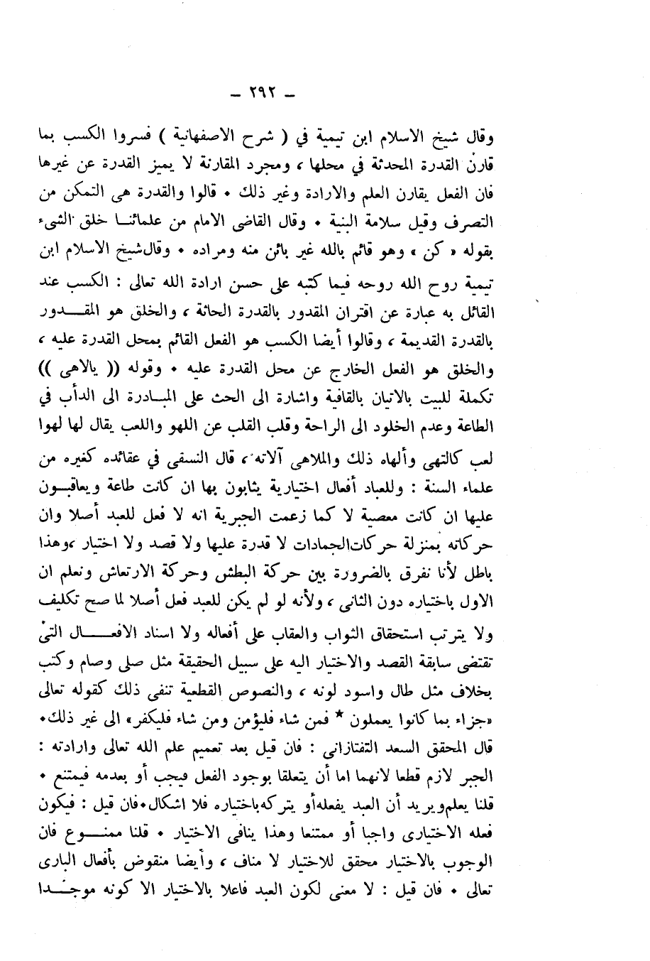 وَقَالَ شَيْخُ الْإِسْلَامِ ابْنُ تَيْمِيَّةَ فِي " شَرْحِ الْأَصْفَهَانِيَّةِ ": فَسَّرُوا الْكَسْبَ بِمَا قَارَنَ الْقُدْرَةَ الْمُحْدَثَةَ فِي مَحَلِّهَا، وَمُجَرَّدُ الْمُقَارِنَةِ لَا يُمَيِّزُ الْقُدْرَةَ عَنْ غَيْرِهَا، فَإِنَّ الْفِعْلَ يُقَارِنُ الْعِلْمَ وَالْإِرَادَةَ، وَغَيْرَ ذَلِكَ.