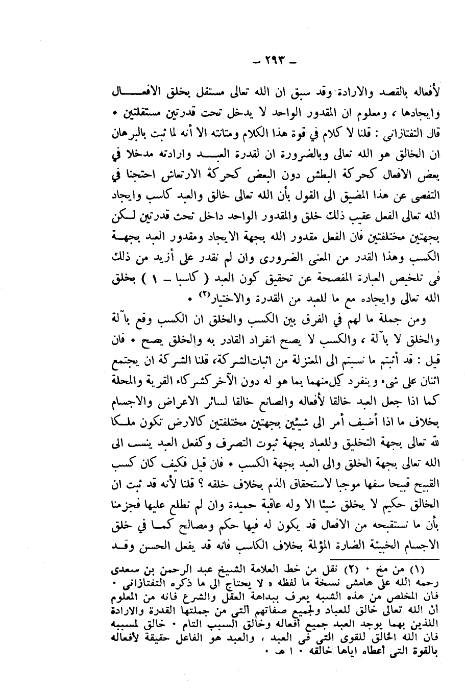 قَالَ التَّفْتَازَانِيُّ: قُلْنَا لَا كَلَامَ فِي قُوَّةِ هَذَا الْكَلَامِ وَمَتَانَتِهِ، إِلَّا أَنَّهُ لَمَّا ثَبَتَ بِالْبُرْهَانِ أَنَّ الْخَالِقَ هُوَ اللَّهُ - تَعَالَى -، وَبِالضَّرُورَةِ أَنَّ لِقُدْرَةِ الْعَبْدِ وَإِرَادَتِهِ مَدْخَلًا فِي بَعْضِ الْأَفْعَالِ، كَحَرَكَةِ الْبَطْشِ دُونَ الْبَعْضِ كَحَرَكَةِ الِارْتِعَاشِ؛ احْتَجْنَا فِي التَّفَصِّي عَنْ هَذَا الْمَضِيقِ إِلَى الْقَوْلِ بِأَنَّ اللَّهَ - تَعَالَى - خَالِقٌ وَالْعَبْدَ كَاسِبٌ، وَإِيجَادَ اللَّهِ - تَعَالَى - الْفِعْلَ عَقِيبَ ذَلِكَ خَلْقٌ، وَالْمَقْدُورَ الْوَاحِدَ دَاخِلٌ تَحْتَ قُدْرَتَيْنِ، لَكِنْ بِجِهَتَيْنِ مُخْتَلِفَيْنِ. فَإِنَّ الْفِعْلَ مَقْدُورُ اللَّهِ بِجِهَةِ الْإِيجَادِ، وَمَقْدُورُ الْعَبْدِ بِجِهَةِ الْكَسْبِ، وَهَذَا الْقَدَرُ مِنَ الْمَعْنَى الضَّرُورِيِّ، وَإِنْ لَمْ نَقْدِرْ عَلَى أَزْيَدَ مِنْ ذَلِكَ فِي تَلْخِيصِ الْعِبَارَةِ الْمُفْصِحَةِ عَنْ تَحْقِيقِ كَوْنِ الْعَبْدِ كَاسِبًا بِخَلْقِ اللَّهِ - تَعَالَى - وَإِيجَادِهِ مَعَ مَا لِلْعَبْدِ مِنَ الْقُدْرَةِ وَالِاخْتِيَارِ.