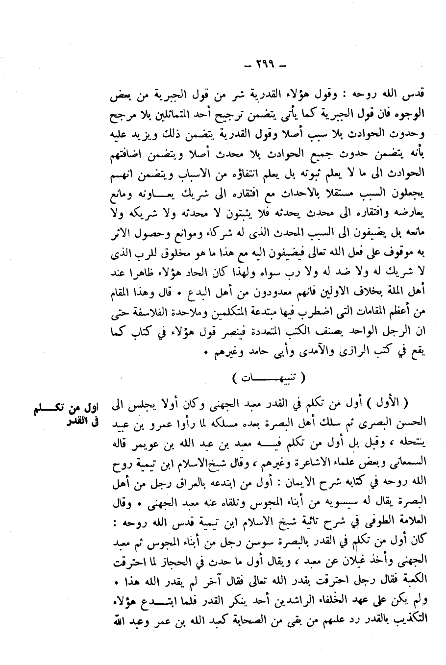 الْأَوَّلَ: أَوَّلُ مَنْ تَكَلَّمَ فِي الْقَدَرِ مَعْبَدٌ الْجُهَنِيُّ، وَكَانَ أَوَّلًا يَجْلِسُ إِلَى الْحَسَنِ الْبَصْرِيِّ، ثُمَّ سَلَكَ أَهْلُ الْبَصْرَةِ بَعْدَهُ مَسْلَكَهُ، لَمَّا رَأَوْا عَمْرَو بْنَ عُبَيْدٍ يَنْتَحِلُهُ، وَقِيلَ: بَلْ أَوَّلُ مَنْ تَكَلَّمَ فِيهِ مَعْبَدُ بْنُ عَبْدِ اللَّهِ بْنِ عُوَيْمِرٍ. قَالَهُ السَّمْعَانِيُّ، وَبَعْضُ عُلَمَاءِ الْأَشَاعِرَةِ وَغَيْرُهُمْ. وَقَالَ شَيْخُ الْإِسْلَامِ ابْنُ تَيْمِيَّةَ - رَوَّحَ اللَّهُ رُوحَهُ - فِي كِتَابِهِ " شَرْحِ الْإِيمَانِ ": أَوَّلُ مَنِ ابْتَدَعَهُ بِالْعِرَاقِ رَجُلٌ مِنْ أَهْلِ الْبَصْرَةِ يُقَالُ لَهُ سِيسَوَيْهِ مِنْ أَبْنَاءِ الْمَجُوسِ وَتَلَقَّاهُ عَنْهُ مَعْبَدٌ الْجُهَنِيُّ.