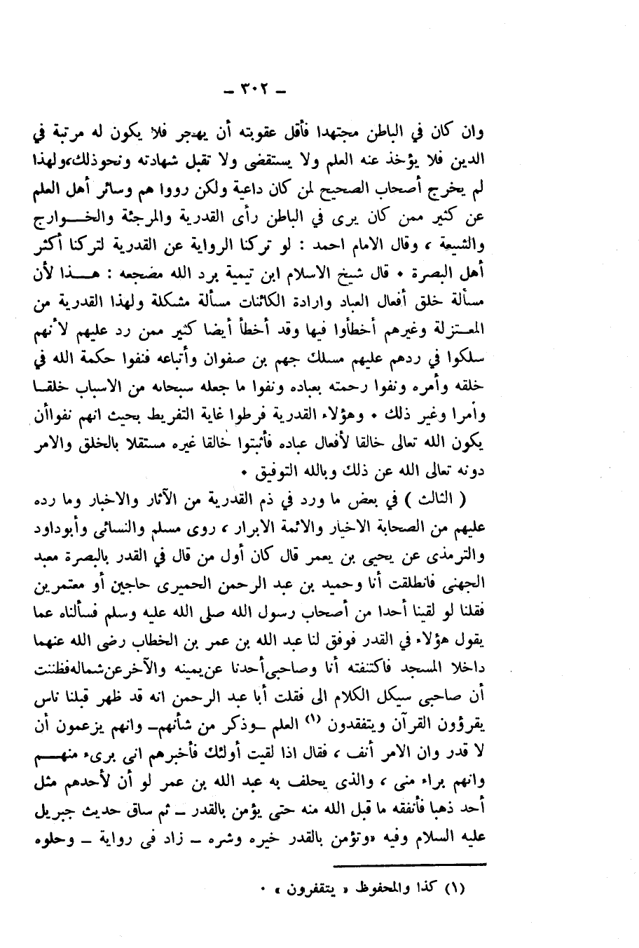الثَّالِثُ: فِي بَعْضِ مَا وَرَدَ فِي ذَمِّ الْقَدَرِيَّةِ مِنَ الْآثَارِ، وَالْأَخْبَارِ، وَمَا رَدَّهُ عَلَيْهِمْ مِنَ الصَّحَابَةِ الْأَخْيَارِ، وَالْأَئِمَّةِ الْأَبْرَارِ. رَوَى مُسْلِمٌ وَالنَّسَائِيُّ وَأَبُو دَاوُدَ وَالتِّرْمِذِيُّ عَنْ يَحْيَى بْنِ يَعْمُرَ، قَالَ: كَانَ أَوَّلَ مَنْ قَالَ فِي الْقَدَرِ بِالْبَصْرَةِ مَعْبَدٌ الْجُهَنِيُّ، فَانْطَلَقْتُ أَنَا وَحُمَيْدُ بْنُ عَبْدِ الرَّحْمَنِ الْحِمْيَرِيُّ حَاجَّيْنِ، أَوْ مُعْتَمِرَيْنِ، فَقُلْنَا: لَوْ لَقِينَا أَحَدًا مِنْ أَصْحَابِ رَسُولِ اللَّهِ - صَلَّى اللَّهُ عَلَيْهِ وَسَلَّمَ - فَسَأَلْنَاهُ عَمَّا يَقُولُ هَؤُلَاءِ فِي الْقَدَرِ، فَوَفَّقَ لَنَا عَبْدَ اللَّهِ بْنَ عُمَرَ بْنِ الْخَطَّابِ - رَضِيَ اللَّهُ عَنْهُمَا - دَاخِلًا الْمَسْجِدَ فَاكْتَنَفْتُهُ أَنَا وَصَاحِبِي، أَحَدُنَا عَنْ يَمِينِهِ، وَالْآخَرُ عَنْ شِمَالِهِ، فَظَنَنْتُ أَنَّ صَاحِبِي سَيَكِلُ الْكَلَامَ إِلَيَّ، فَقُلْتُ: أَبَا عَبْدِ الرَّحْمَنِ إِنَّهُ قَدْ ظَهَرَ قَبْلَنَا نَاسٌ يَقْرَءُونَ الْقُرْآنَ وَيَتَفَقَّدُونَ الْعِلْمَ - وَذَكَرَ مِنْ شَأْنِهِمْ - وَأَنَّهُمْ يَزْعُمُونَ أَنْ لَا قَدَرَ، وَأَنَّ الْأَمْرَ أُنُفٌ، فَقَالَ: إِذَا لَقِيتَ أُولَئِكَ فَأَخْبِرْهُمْ أَنِّي بَرِيءٌ مِنْهُمْ وَأَنَّهُمْ بُرَآءُ مِنِّي، وَالَّذِي يَحْلِفُ بِهِ عَبْدُ اللَّهِ بْنُ عُمَرَ لَوْ أَنَّ لِأَحَدِهِمْ مِثْلَ أُحُدٍ ذَهَبًا فَأَنْفَقَهُ، مَا قَبِلَ اللَّهُ مِنْهُ حَتَّى يُؤْمِنَ بِالْقَدْرِ - ثُمَّ سَاقَ حَدِيثَ جِبْرِيلَ - عَلَيْهِ السَّلَامُ - وَفِيهِ " وَتُؤْمِنَ بِالْقَدْرِ خَيْرِهِ وَشَرِّهِ - زَادَ فِي رِوَايَةٍ - وَحُلْوِهِ