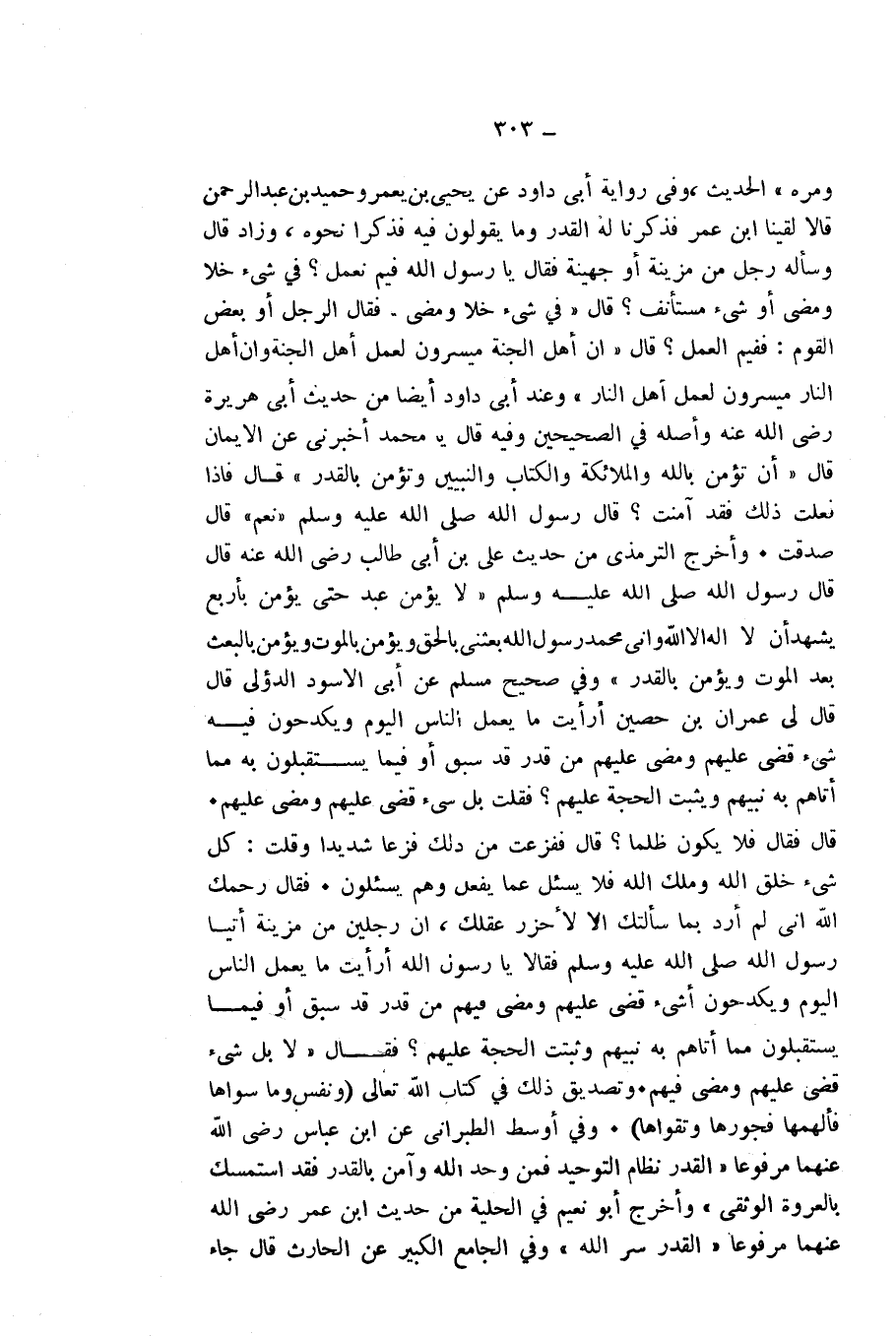 وَفِي صَحِيحِ مُسْلِمٍ عَنْ أَبِي الْأَسْوَدِ الدُّؤَلِيِّ قَالَ: قَالَ لِي عِمْرَانُ بْنُ حُصَيْنٍ: أَرَأَيْتَ مَا يَعْمَلُ النَّاسُ الْيَوْمَ وَيَكْدَحُونَ فِيهِ شَيْءٌ قُضِيَ عَلَيْهِمْ، وَمَضَى عَلَيْهِمْ مِنْ قَدَرٍ قَدْ سَبَقَ، أَوْ فِيمَا يَسْتَقْبِلُونَ بِهِ مِمَّا أَتَاهُمْ بِهِ نَبِيُّهُمْ، وَيُثْبِتُ الْحُجَّةَ عَلَيْهِمْ؟ فَقُلْتُ: بَلْ شَيْءٌ مَضَى عَلَيْهِمْ، وَقُضِيَ عَلَيْهِمْ. قَالَ: فَقَالَ: فَلَا يَكُونُ ظَالِمًا؟ قَالَ: فَفَزِعْتُ مِنْ ذَلِكَ فَزَعًا شَدِيدًا، وَقُلْتُ: كُلُّ شَيْءٍ خَلَقَ اللَّهُ وَمَلَكَ اللَّهُ فَلَا يُسْأَلُ عَمَّا يَفْعَلُ وَهُمْ يُسْأَلُونَ. فَقَالَ: رَحِمَكَ اللَّهُ، إِنِّي لَمْ أُرِدْ بِمَا سَأَلْتُكَ إِلَّا لِأَحْزُرَ عَقْلَكَ، «إِنَّ رَجُلَيْنِ مِنْ مُزَيْنَةَ أَتَيَا رَسُولَ اللَّهِ - صَلَّى اللَّهُ عَلَيْهِ وَسَلَّمَ - فَقَالَا: يَا رَسُولَ اللَّهِ أَرَأَيْتَ مَا يَعْمَلُ النَّاسُ الْيَوْمَ وَيَكْدَحُونَ، أَشَيْءٌ قُضِيَ عَلَيْهِمْ وَمَضَى فِيهِمْ؟ وَتَصْدِيقُ ذَلِكَ فِي كِتَابِ اللَّهِ - تَعَالَى -: {وَنَفْسٍ وَمَا سَوَّاهَا - فَأَلْهَمَهَا فُجُورَهَا وَتَقْوَاهَا} [الشمس: 7 - 8] » وَفِي أَوْسَطِ الطَّبَرَانِيِّ عَنِ ابْنِ عَبَّاسٍ - رَضِيَ اللَّهُ عَنْهُمَا - مَرْفُوعًا " «الْقَدَرُ نِظَامُ التَّوْحِيدِ، فَمَنْ وَحَّدَ اللَّهَ وَآمَنَ بِالْقَدَرِ فَقَدِ اسْتَمْسَكَ بِالْعُرْوَةِ الْوُثْقَى» " وَأَخْرَجَ أَبُو نُعَيْمٍ فِي الْحِلْيَةِ مِنْ حَدِيثِ ابْنِ عُمَرَ - رَضِيَ اللَّهُ عَنْهُمَا - مَرْفُوعًا " «الْقَدَرُ سِرُّ اللَّهِ» " وَفِي الْجَامِعِ الْكَبِيرِ عَنِ الْحَارِثِ، قَالَ: جَاءَ