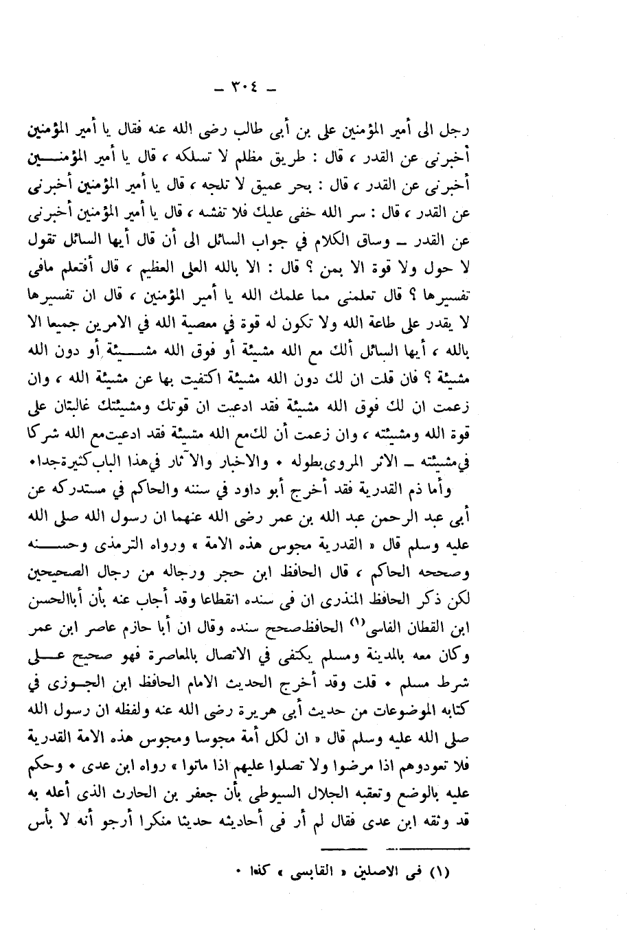 رَجُلٌ إِلَى أَمِيرِ الْمُؤْمِنِينَ عَلِيِّ بْنِ أَبِي طَالِبٍ - رَضِيَ اللَّهُ عَنْهُ - فَقَالَ: يَا أَمِيرَ الْمُؤْمِنِينَ أَخْبِرْنِي عَنِ الْقَدَرِ، قَالَ: طَرِيقٌ مُظْلِمٌ لَا تَسْلُكْهُ، قَالَ: يَا أَمِيرَ الْمُؤْمِنِينَ أَخْبِرْنِي عَنِ الْقَدَرِ، قَالَ: بَحْرٌ عَمِيقٌ لَا تَلِجْهُ، فَقَالَ: يَا أَمِيرَ الْمُؤْمِنِينَ أَخْبِرْنِي عَنِ الْقَدَرِ، قَالَ: سِرُّ اللَّهِ خَفِيَ عَلَيْكَ فَلَا تُفْشِهِ، قَالَ: يَا أَمِيرَ الْمُؤْمِنِينَ أَخْبِرْنِي عَنِ الْقَدَرِ - وَسَاقَ الْكَلَامَ فِي جَوَابِ السَّائِلِ، إِلَى أَنَّهُ قَالَ: أَيُّهَا السَّائِلُ تَقُولُ: لَا حَوْلَ وَلَا قُوَّةَ إِلَّا بِمَنْ؟ قَالَ: إِلَّا بِاللَّهِ الْعَلِيِّ الْعَظِيمِ، قَالَ: أَفَتَعْلَمُ مَا فِي تَفْسِيرِهَا؟ قَالَ: تُعَلِّمُنِي مِمَّا عَلَّمَكَ اللَّهُ يَا أَمِيرَ الْمُؤْمِنِينَ، قَالَ: إِنَّ تَفْسِيرَهَا لَا يَقْدِرُ عَلَى طَاعَةِ اللَّهِ، وَلَا تَكُونُ لَهُ قُوَّةٌ فِي مَعْصِيَةِ اللَّهِ، فِي الْأَمْرَيْنِ جَمِيعًا إِلَّا بِاللَّهِ، أَيُّهَا السَّائِلُ أَلَكَ مَعَ اللَّهِ مَشِيئَةٌ، أَوْ فَوْقَ اللَّهِ مَشِيئَةٌ، أَوْ دُونَ اللَّهِ مَشِيئَةٌ؟ فَإِنْ قُلْتَ: إِنَّ لَكَ دُونَ اللَّهِ مَشِيئَةً، اكْتَفَيْتَ بِهَا عَنْ مَشِيئَةِ اللَّهِ، وَإِنْ زَعَمْتَ أَنَّ لَكَ فَوْقَ اللَّهِ مَشِيئَةً، فَقَدِ ادَّعَيْتَ أَنَّ قُوَّتَكَ وَمَشِيئَتَكَ غَالِبَتَانِ عَلَى قُوَّةِ اللَّهِ وَمَشِيئَتِهِ، وَإِنْ زَعَمْتَ أَنَّ لَكَ مَعَ اللَّهِ مَشِيئَةً، فَقَدِ ادَّعَيْتَ مَعَ اللَّهِ شِرْكًا فِي مَشِيئَتِهِ. الْأَثَرُ الْمَرْوِيُّ بِطُولِهِ، وَالْأَخْبَارُ وَالْآثَارُ فِي هَذَا الْبَابِ كَثِيرَةٌ جِدًّا.