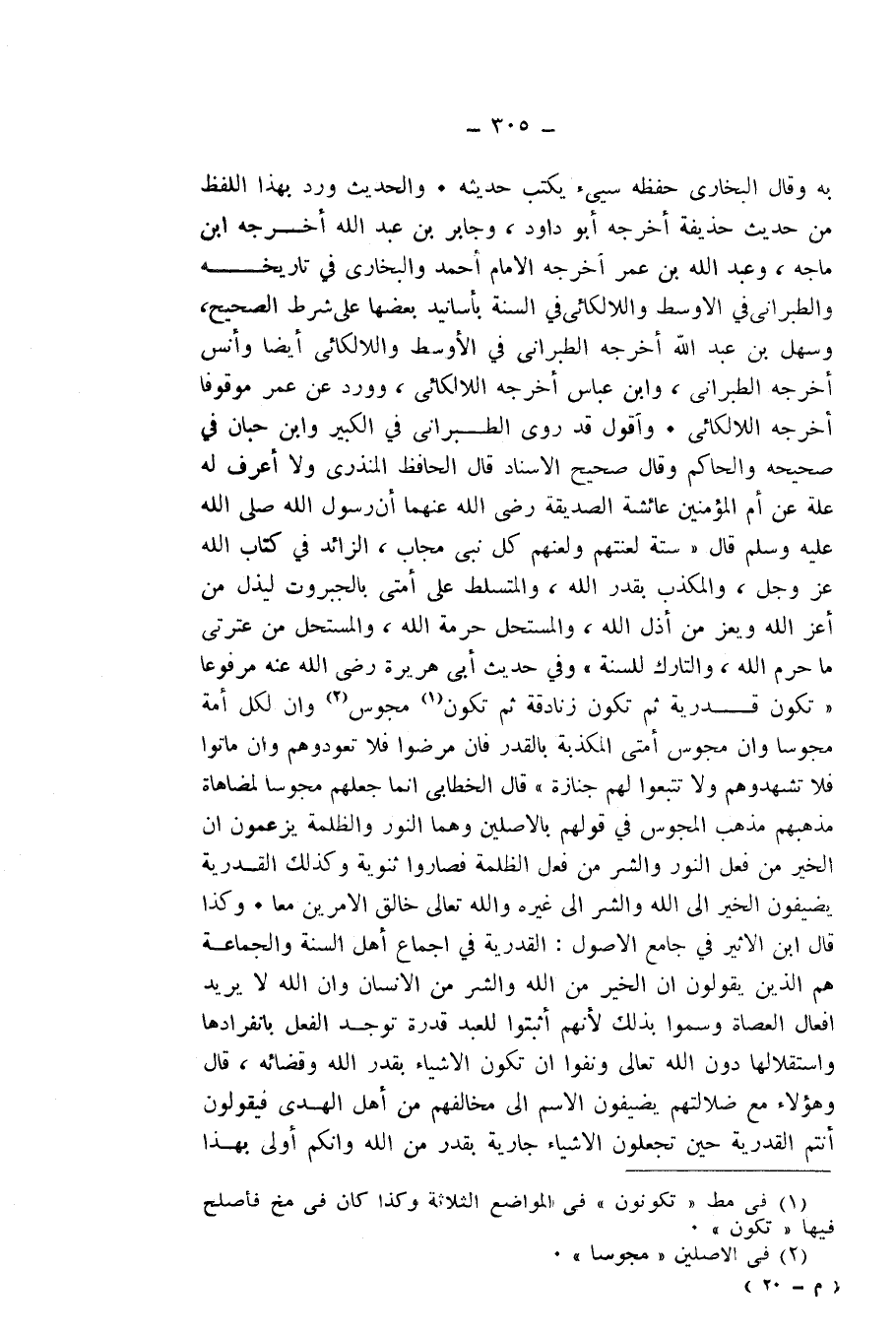 وَأَقُولُ: قَدْ رَوَى الطَّبَرَانِيُّ فِي الْكَبِيرِ وَابْنُ حِبَّانَ فِي صَحِيحِهِ، وَالْحَاكِمُ، وَقَالَ: صَحِيحُ الْإِسْنَادِ، قَالَ الْحَافِظُ الْمُنْذِرِيُّ: وَلَا أَعْرِفُ لَهُ عِلَّةً عَنْ أُمِّ الْمُؤْمِنِينَ عَائِشَةَ الصِّدِّيقَةِ - رَضِيَ اللَّهُ عَنْهَا - أَنَّ رَسُولَ اللَّهِ - صَلَّى اللَّهُ عَلَيْهِ وَسَلَّمَ - قَالَ: " «سِتَّةٌ لَعَنْتُهُمْ وَلَعَنَهُمْ كُلُّ نَبِيٍّ مُجَابٍ: الزَّائِدُ فِي كِتَابِ اللَّهِ - عَزَّ وَجَلَّ، وَالْمُكَذِّبُ بِقَدَرِ اللَّهِ، وَالْمُتَسَلِّطُ عَلَى أُمَّتِي بِالْجَبَرُوتِ لِيُذِلَّ مَنْ أَعَزَّ اللَّهُ وَيُعِزَّ مَنْ أَزَلَّ اللَّهُ، وَالْمُسْتَحِلُّ حُرْمَةَ اللَّهِ، وَالْمُسْتَحِلُّ مِنْ عِتْرَتِي مَا حَرَّمَ اللَّهُ، وَالتَّارِكُ لِلسُّنَّةِ» " وَفِي حَدِيثِ أَبِي هُرَيْرَةَ - رَضِيَ اللَّهُ عَنْهُ - مَرْفُوعًا " «تَكُونُ قَدَرِيَّةٌ ثُمَّ تَكُونُ زَنَادِقَةٌ ثُمَّ تَكُونُ مَجُوسٌ، وَإِنَّ لِكُلِّ أُمَّةٍ مَجُوسًا، وَإِنَّ مَجُوسَ أُمَّتِي الْمُكَذِّبَةُ بِالْقَدَرِ، فَإِنْ مَرِضُوا فَلَا تَعُودُوهُمْ، وَإِنْ مَاتُوا فَلَا تَشْهَدُوهُمْ، وَلَا تَتْبَعُوا لَهُمْ جَنَازَةً» " قَالَ الْخَاطِبِيُّ: إِنَّمَا جَعَلَهُمْ مَجُوسًا لِمُضَاهَاةِ مَذْهَبِهِمْ مَذْهَبَ الْمَجُوسِ فِي قَوْلِهِمْ بِالْأَصْلَيْنِ، وَهُمَا النُّورُ وَالظُّلْمَةُ، يَزْعُمُونَ أَنَّ الْخَيْرَ مَنْ فَعَلَ النُّورَ، وَالشَّرَّ مَنْ فَعَلَ الظُّلْمَةَ فَصَارُوا ثَنَوِيَّةً، وَكَذَلِكَ الْقَدَرِيَّةُ يُضِيفُونَ الْخَيْرَ إِلَى اللَّهِ، وَالشَّرَّ إِلَى غَيْرِهِ، وَاللَّهُ - تَعَالَى - خَالِقُ الْأَمْرَيْنِ مَعًا.