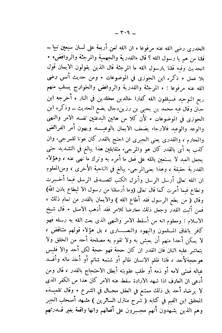 الْخُدْرِيِّ - رَضِيَ اللَّهُ عَنْهُ - مَرْفُوعًا " «إِنَّ اللَّهَ لَعَنَ أَرْبَعَةً عَلَى لِسَانِ سَبْعِينَ نَبِيًّا - قُلْنَا: مَنْ هُمْ يَا رَسُولَ اللَّهِ؟ قَالَ: " الْقَدَرِيَّةُ والْجَهْمِيَّةُ وَالْمُرْجِئَةُ وَالرَّوَافِضُ» " الْحَدِيثَ. «وَفِيهِ: قُلْنَا: يَا رَسُولَ اللَّهِ مَا الْمُرْجِئَةُ، قَالَ: الَّذِينَ يَقُولُونَ الْإِيمَانُ قَوْلٌ بِلَا عَمَلٍ» . ذَكَرَهُ ابْنُ الْجَوْزِيِّ فِي الْمَوْضُوعَاتِ. وَمِنْ حَدِيثِ أَنَسٍ - رَضِيَ اللَّهُ عَنْهُ - مَرْفُوعًا: " «الْمُرْجِئَةُ وَالْقَدَرِيَّةُ وَالرَّوَافِضُ وَالْخَوَارِجُ يُسْلَبُ مِنْهُمْ رُبُعُ التَّوْحِيدِ فَسَيَلْقَوْنَ اللَّهَ كُفَّارًا خَالِدِينَ مُخَلَّدِينَ فِي النَّارِ» " أَخْرَجَهُ ابْنُ حِبَّانَ، وَقَالَ: فِيهِ مُحَمَّدُ بْنُ يَحْيَى بْنُ رَزِينٍ دَجَّالٌ يَضَعُ الْحَدِيثَ - وَذَكَرَهُ ابْنُ الْجَوْزِيِّ فِي الْمَوْضُوعَاتِ ; لِأَنَّ كُلًّا مِنْ هَاتَيْنِ الْبِدْعَتَيْنِ تُفْسِدُ الْأَمْرَ وَالنَّهْيَ، وَالْوَعْدَ وَالْوَعِيدَ، فَالْإِرْجَاءُ يُضْعِفُ الْإِيمَانَ بِالْوَعِيدِ، وَيُهَوِّنُ مِنْ أَمْرِ الْفَرَائِضِ وَالْمَحَارِمِ، وَالْقَدَرِيُّ - يَعْنِي الْجَبْرِيَّ - إِنِ احْتَجَّ بِالْقَدَرِ كَانَ عَوْنًا لِلْمُرْجِئِ، وَإِنْ كَذَّبَ بِهِ - أَيْ بِالْقَدَرِ؛ كَانَ هُوَ وَالْمُرْجِئُ مُتَقَابِلَيْنِ، هَذَا يُبَالِغُ فِي التَّشْدِيدِ حَتَّى يَجْعَلَ الْعَبْدَ لَا يَسْتَعِينُ بِاللَّهِ عَلَى فِعْلِ مَا أَمَرَهُ بِهِ وَتَرْكِ مَا نَهَى عَنْهُ، وَهَؤُلَاءِ الْقَدَرِيَّةُ حَقِيقَةً، وَهَذَا - يَعْنِي الْمُرْجِئَ - يُبَالِغُ فِي النَّاحِيَةِ الْأُخْرَى، وَمِنَ الْمَعْلُومِ أَنَّ اللَّهَ - تَعَالَى - أَرْسَلَ الرُّسُلَ وَأَنْزَلَ الْكُتُبَ لِتُصَدِّقَ الرُّسُلَ فِيمَا أَخْبَرَتْ بِهِ، وَتُطَاعَ فِيمَا أَمَرَتْ كَمَا قَالَ - تَعَالَى -: {وَمَا أَرْسَلْنَا مِنْ رَسُولٍ إِلَّا لِيُطَاعَ بِإِذْنِ اللَّهِ} [النساء: 64] وَقَالَ: {مَنْ يُطِعِ الرَّسُولَ فَقَدْ أَطَاعَ اللَّهَ} [النساء: 80] ، وَالْإِيمَانُ بِالْقَدَرِ مِنْ تَمَامِ ذَلِكَ، فَمَنْ أَثْبَتَ الْقَدَرَ وَجَعَلَ ذَلِكَ مُعَارِضًا لِلْأَمْرِ فَقَدْ أَذْهَبَ الْأَصْلَ. قَالَ شَيْخُ الْإِسْلَامِ: وَمَعْلُومٌ أَنَّهُ مَنْ أَسْقَطَ الْأَمْرَ وَالنَّهْيَ الَّذِي بَعَثَ اللَّهُ بِهِ رُسُلَهُ، فَهُوَ كَافِرٌ بِاتِّفَاقِ الْمُسْلِمِينَ وَالْيَهُودِ وَالنَّصَارَى، بَلْ هَؤُلَاءِ قَوْلُهُمْ مُتَنَاقِضٌ، لَا يُمْكِنُ أَحَدًا مِنْهُمْ أَنْ يَعِيشَ بِهِ، وَلَا تَقُومُ بِهِ مَصْلَحَةُ أَحَدٍ مِنَ الْخَلْقِ، وَلَا يَتَعَاشَرُ عَلَيْهِ اثْنَانِ، فَإِنَّ الْقَدَرَ إِنْ كَانَ حُجَّةً فَهُوَ حُجَّةٌ لِكُلِّ أَحَدٍ، وَإِلَّا فَلَيْسَ هُوَ حُجَّةً لِأَحَدٍ، فَإِذَا ظَلَمَ الْإِنْسَانَ ظَالِمٌ، أَوْ شَتَمَهُ شَاتِمٌ، أَوْ أَخَذَ مَالَهُ، وَأَفْسَدَ عِيَالَهُ فَمَتَى لَامَهُ أَوْ ذَمَّهُ أَوْ طَلَبَ عُقُوبَتَهُ أَبْطَلَ الِاحْتِجَاجَ بِالْقَدَرِ، قَالَ: وَمَنِ ادَّعَى أَنَّ الْعَارِفَ إِذَا شَهِدَ الْإِرَادَةَ سَقَطَ عَنْهُ الْأَمْرُ؛ كَانَ هَذَا مِنَ الْكُفْرِ الَّذِي لَا يَرْضَاهُ أَحَدٌ، بَلْ ذَلِكَ مُمْتَنِعٌ فِي الْعَقْلِ مُحَالٌ فِي الشَّرْعِ. وَقَالَ تِلْمِيذُهُ الْمُحَقِّقُ ابْنُ الْقَيِّمِ فِي كِتَابِهِ " شَرْحِ مَنَازِلِ السَّائِرِينَ ": مَشْهَدُ أَصْحَابِ الْجَبْرِ: وَهُمُ الَّذِينَ يَشْهَدُونَ أَنَّهُمْ مُجْبَرُونَ عَلَى أَفْعَالِهِمْ، وَأَنَّهَا وَاقِعَةٌ بِغَيْرِ قُدْرَتِهِمْ