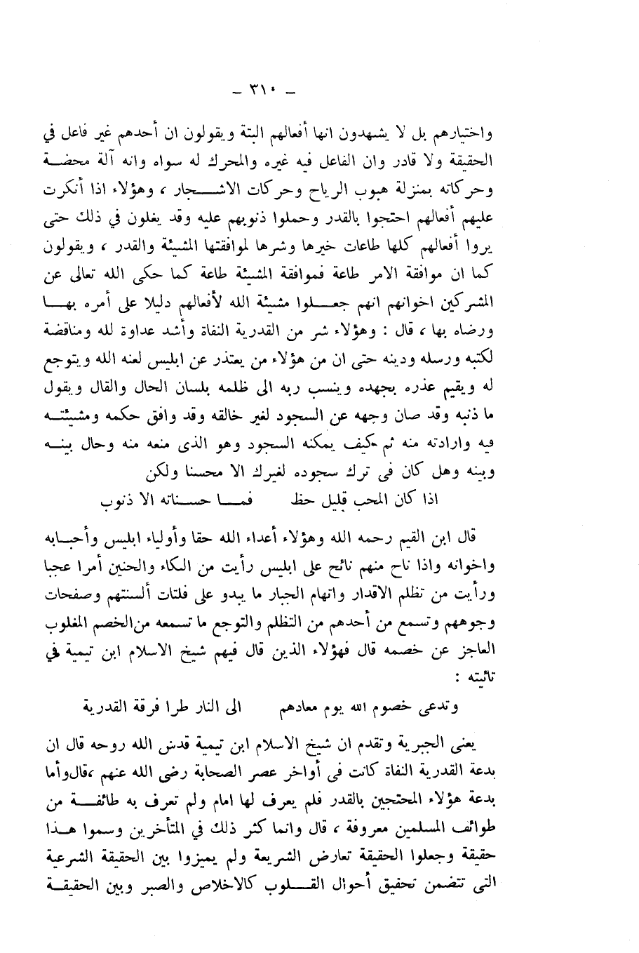 وَاخْتِيَارِهِمْ، بَلْ لَا يَشْهَدُونَ أَنَّهَا أَفْعَالُهُمُ الْبَتَّةَ، وَيَقُولُونَ: إِنَّ أَحَدَهُمْ غَيْرُ فَاعِلٍ فِي الْحَقِيقَةِ وَلَا قَادِرٍ، وَأَنَّ الْفَاعِلَ فِيهِ غَيْرُهُ، وَالْمُحَرِّكَ لَهُ سِوَاهُ، وَأَنَّهُ آلَةٌ مَحْضَةٌ، وَحَرَكَاتُهُ بِمَنْزِلَةِ هُبُوبِ الرِّيَاحِ وَحَرَكَاتِ الْأَشْجَارِ، وَهَؤُلَاءِ إِذَا أَنْكَرْتَ عَلَيْهِمْ أَفْعَالَهُمُ احْتَجُّوا بِالْقَدَرِ وَحَمَلُوا ذُنُوبَهُمْ عَلَيْهِ، وَقَدْ يَغْلُونَ فِي ذَلِكَ حَتَّى يَرَوْا أَفْعَالَهُمْ كُلَّهَا طَاعَاتٍ خَيْرَهَا وَشَرَّهَا لِمُوَافَقَتِهَا الْمَشِيئَةَ وَالْقَدَرَ، وَيَقُولُونَ: كَمَا أَنَّ مُوَاجَهَةَ الْأَمْرِ طَاعَةٌ، فَمُوَافَقَةُ الْمَشِيئَةِ طَاعَةٌ، كَمَا حَكَى اللَّهُ - تَعَالَى - عَنِ الْمُشْرِكِينَ إِخْوَانِهِمْ أَنَّهُمْ جَعَلُوا مَشِيئَةَ اللَّهِ لِأَفْعَالِهِمْ دَلِيلًا عَلَى أَمْرِهِ بِهَا وَرِضَاهُ بِهَا، قَالَ: وَهَؤُلَاءِ شَرٌّ مِنَ الْقَدَرِيَّةِ النُّفَاةِ، وَأَشَدُّ عَدَاوَةً لِلَّهِ وَمُنَاقِضَةً لِكُتُبِهِ وَرُسُلِهِ وَدِينِهِ، حَتَّى إِنَّ مِنْ هَؤُلَاءِ مَنْ يَعْتَذِرُ عَنْ إِبْلِيسَ - لَعَنَهُ اللَّهُ - وَيَتَوَجَّعُ لَهُ، وَيُقِيمُ عُذْرَهُ بِجَهْدِهِ، وَيَنْسُبُ رَبَّهُ إِلَى ظُلْمِهِ بِلِسَانِ الْحَالِ وَالْقَالِ، وَيَقُولُ: مَا ذَنْبُهُ وَقَدْ صَانَ وَجْهَهُ مِنَ السُّجُودِ لِغَيْرِ خَالِقِهِ، وَقَدْ وَافَقَ حُكْمَهُ وَمَشِيئَتَهُ فِيهِ وَإِرَادَتَهُ مِنْهُ، ثُمَّ كَيْفَ يُمْكِنُهُ السُّجُودُ، وَهُوَ الَّذِي مَنَعَهُ مِنْهُ وَحَالَ بَيْنَهُ وَبَيْنَهُ، وَهَلْ كَانَ فِي تَرْكِ سُجُودِهِ لِغَيْرِكَ إِلَّا مُحْسِنًا؟ وَلَكِنْ: