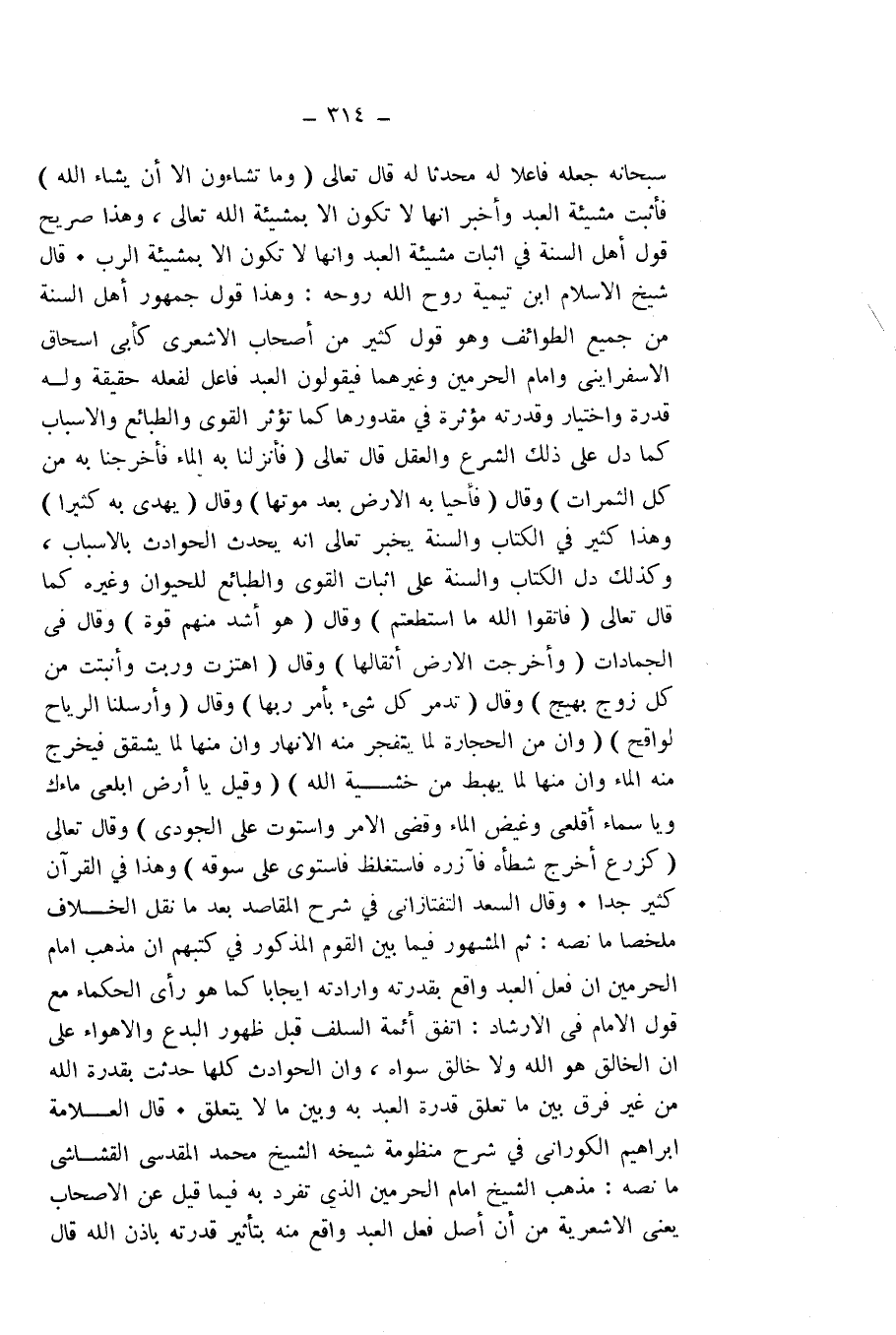 قَالَ الْعَلَّامَةُ إِبْرَاهِيمُ الْكُورَانِيُّ فِي شَرْحِ مَنْظُومَةِ شَيْخِهِ الشَّيْخِ مُحَمَّدٍ الْمَقْدِسِيِّ الْقُشَاشِيِّ مَا نَصُّهُ: مَذْهَبُ الشَّيْخِ إِمَامِ الْحَرَمَيْنِ الَّذِي تَفَرَّدَ بِهِ فِيمَا قِيلَ عَنِ الْأَصْحَابِ - يَعْنِي الْأَشْعَرِيَّةَ - مِنْ أَنَّ أَصْلَ فِعْلِ الْعَبْدِ وَاقِعٌ مِنْهُ بِتَأْثِيرِ قُدْرَتِهِ بِإِذْنِ اللَّهِ، قَالَ: